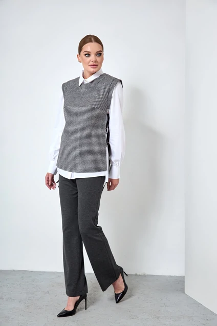 Комплект состоит из свободного жилета на подкладе прямого силуэта с ассиметричным низом (спинка длиннее переда на 5 см).По бокам жилета расположена застежка для шнуровки из металлических полуколец. Перед жилета имеет отрезную кокетку по линии груди, округлую горловину-обтачку и плечевую кокетку, которая переходит на спинку. Спинка жилета имеет центральный средний шов и талиевые вытачки для прилегания. Пройма по окату дополнена стабильной полосой-крылом, шириной 3 см. Длина переда жилета 64 см. Длина спинки по среднему шву 67 см. От плеча 69 см