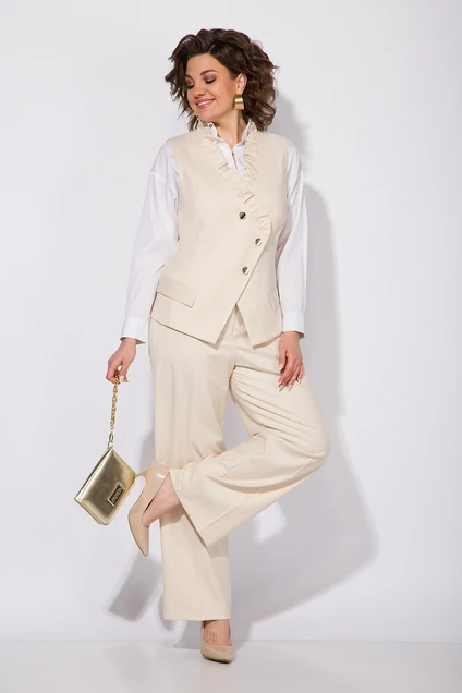 Эффектный офисный костюм, состоящий из брюк и жилетки. Оригинальная жилетка на шелковой подкладке, с ассиметричной застежкой на пуговицы. Вырез горловины v-образной формы с рюшей из основной ткани. Жилетка с прорезными карманами с клапаном. Спинка приталенная. Брюки прямого кроя, на притачном поясе. Застежка - брючная тесьма-молния с обработанным гульфиком. В боковых участках пояса вставлена резинка для более комфортного прилегания. В брюках заутюжены канты. Такой костюм можно носить в комплекте или раздельно, дополнить блузкой для деловой встречи или футболкой для модной вечеринки. В таком костюме вы всегда будете чувствовать себя превосходно! Длина жилетки – 60 см. Брюк – 104 см.