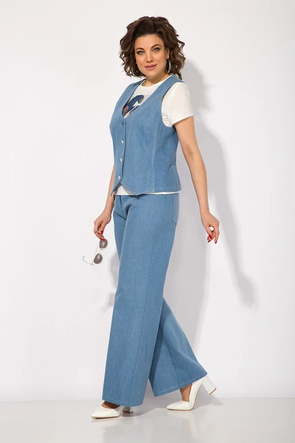 Представляем Вам стильный женский брючный костюм, состоящий из жилетки и брюк. Эта легкая и воздушная джинсовая одежда из «денима», подойдет для любой женщины в любом возрасте и размере. Жилетка полуприлегающего силуэта, с боковыми рельефами и нагрудной выточкой. Застежка центральная, с подбортом на петли и пуговицы. Спинка с хлястиком и регулировкой на металлические полукольца для комфортного прилегания. В комплекте брюки прямого кроя, с завышенной посадкой по типу джинсов. Застежка 0 брючная тесьма-молния с гульфиком. Пояс притачной, в боковых швах вставлена резинка для комфортного прилегания по талии. Брюки с карманами и шлевками для пояса. По спинке накладные карманы с декоративной нашивкой-шеврон. Яркий и стильный брючный костюм девушек и женщин - это идеальный выбор для тех, кто хочет выглядеть модно и элегантно в любое время года, в том числе весеннее и осеннее время. Длина жилетки – по спинке 52см