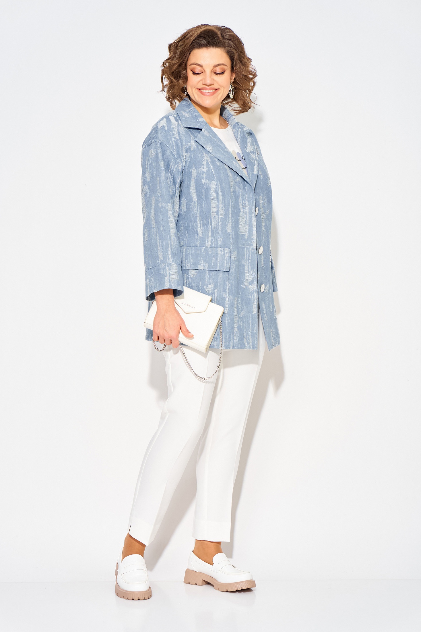 Джинсовый женский жакет идеальный выбор для создания стильного весенне-летнего образа 2026 года. Современный, светлый дизайн с эффектом гранжа придает свою изюминку изделию. Модель свободного силуэта, на спущенном плечевом поясе. Воротник отложной, английского типа с подбортом. Застежка центральная на петли и пуговицы. По полочке и спинке расположены продольные рельефы для комфортного прилегания. Спереди расположены накладные карманы с клапаном.