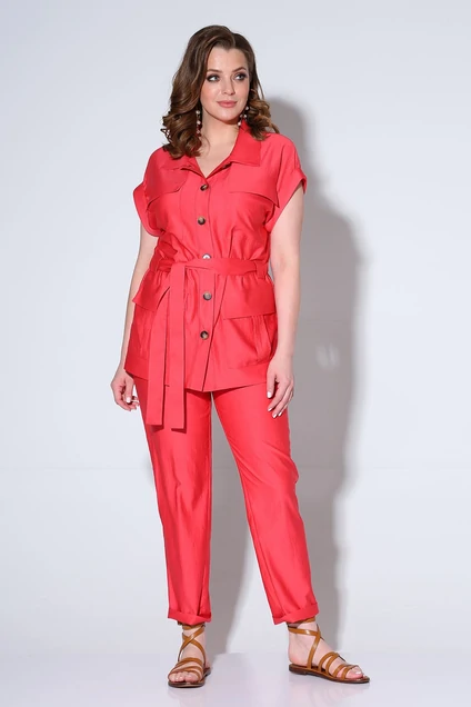 Летний женский костюм выполнен из лёгкой ткани. Жакет со спущенной линией плеча, стояче-отложным воротником и центральной застёжкой на петли и пуговицы. На уровне талии по бокам кулиса с поясом. По переду накладные карманы с клапанами. Брюки зауженные к низу, верхний срез брюк на притачном поясе на резинке и функциональным шнуром из основной ткани.