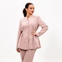 Блуза прямого силуэта со спущенной линией плеча и нагрудными вытачками. По переду и спинке блузы отлетная деталь которая завязывается на боку. Брюки зауженные к низу длинной 7/8. Верхний край брюк на притачном поясе, по спинке от боковых швов вставлена эластичная тесьма. Застежка брюк спереди по типу «гульфик». На задних половинках брюк декоративные листочки, в боковых швах карманы с наклонным входом.