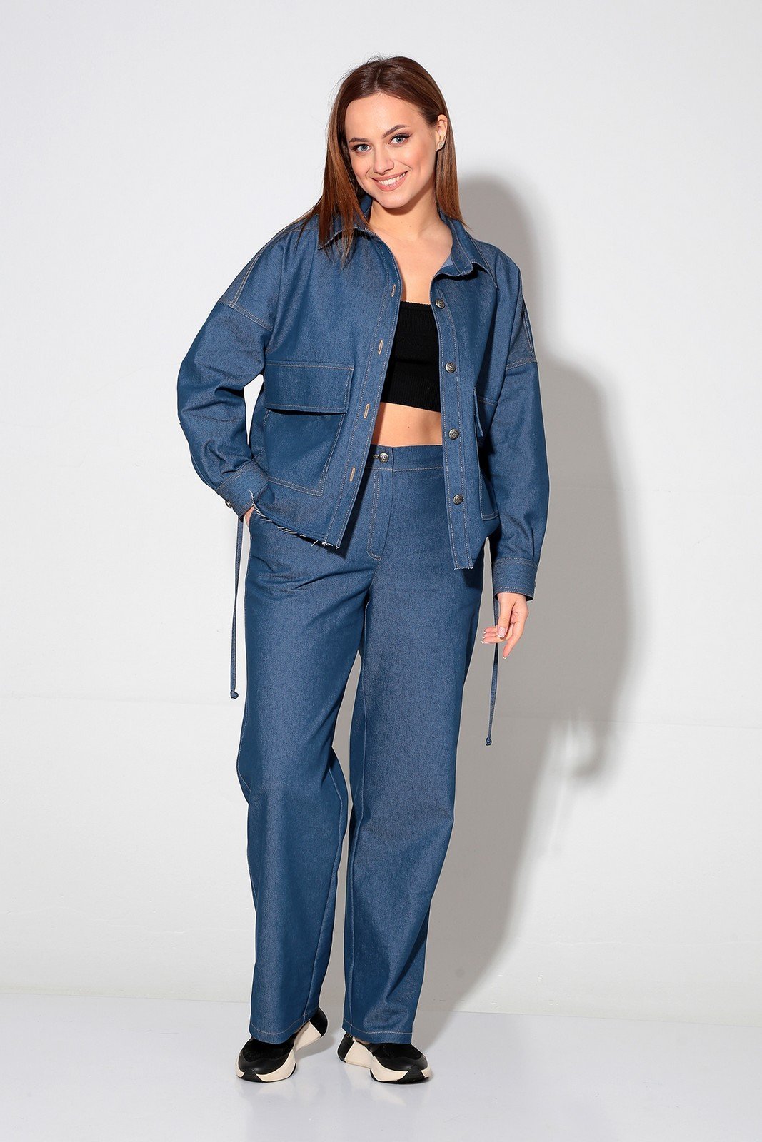 Жакет прямого силуэта со спущенной линией плеча. Воротник рубашечного типа. По переду накладные карманы с клапаном. Центральная застёжка на петли и пуговицы. По спинке настроченная кулиса со шнуром из основной ткани. Низ рукава на притачной манжете с застёжкой на петлю и пуговицу. Брюки на притачном поясе, от середины передних половинок и по спинке на резинке. Застежка брюк спереди по типу «гульфик». По бокам карманы с наклонным входом. Сзади накладные карманы.