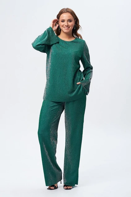 Костюм выполнен из струящейся ткани с люрексом. Блуза свободного силуэта. Горловина округлой формы обработана обтачкой. Рукав втачной, расклешённый к низу. По переду блузы нагрудные выточки, по боковым швам разрезы. Брюки прямого силуэта. Верх брюк на притачном поясе с эластичной тесьмой. В боковых швах карманы с наклонным входом.