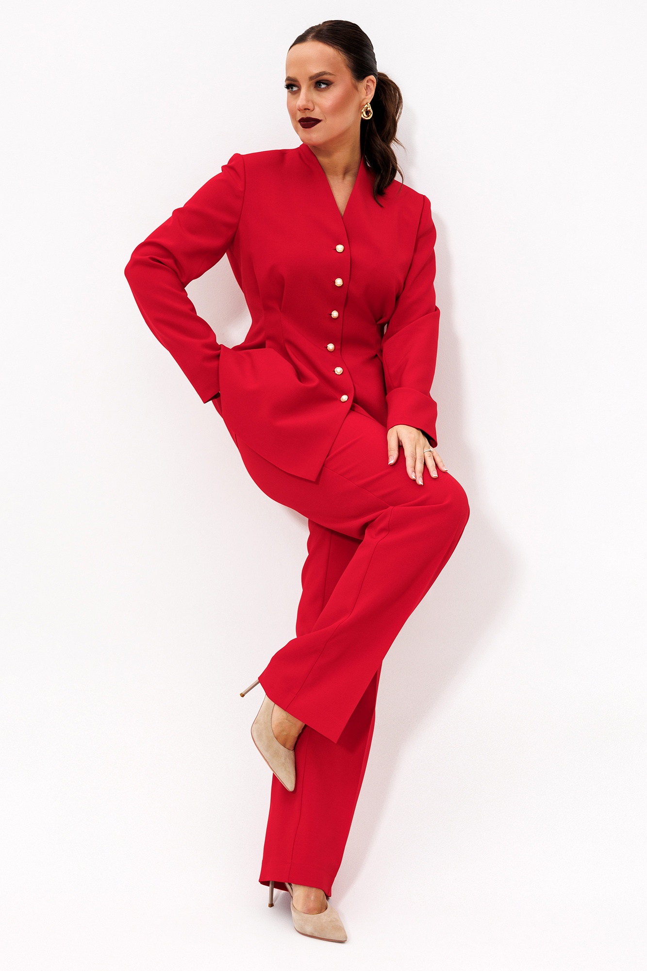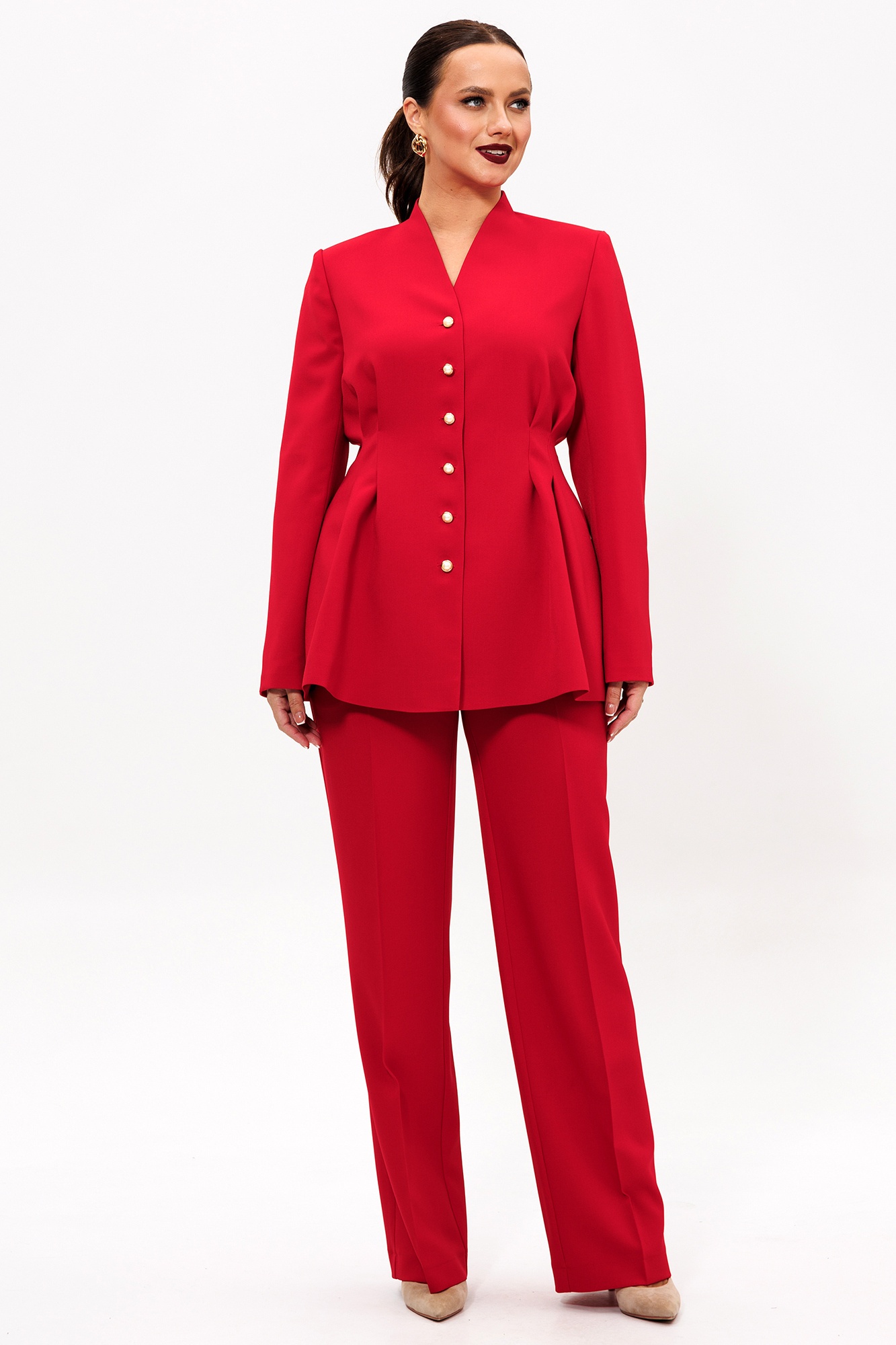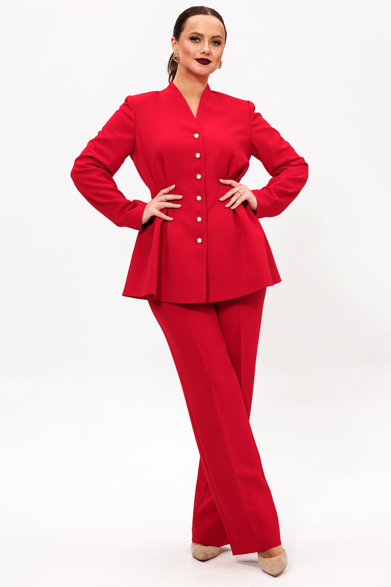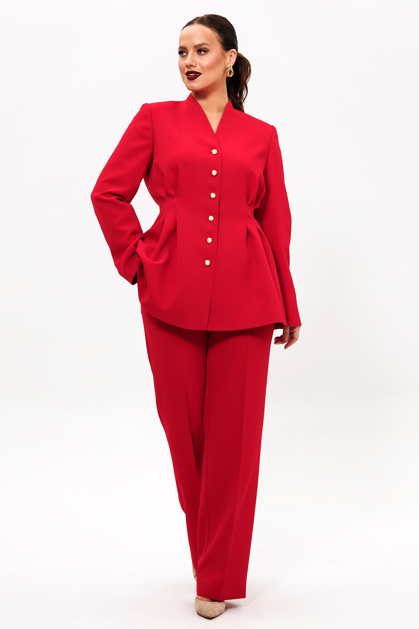 Жакет выполнен из костюмной ткани. Жакет Х-образного силуэта, длиной чуть ниже линии бёдер. Спереди центральная застежка на петли и пуговицы. По переду и спинке в области талии заложены складки. Спинка со средним швом. Воротник - цельнокроеная стойка. Рукав втачной двух шовный. Жакет на подкладке. Брюки прямого кроя. На передних половинках небольшая складка, переходящая в стрелку. Верхний срез брюк обработан притачным поясом, по бокам вставлена резинка, имеются шлёвки под ремень. Застёжка брюк по типу «гульфик». В боковых швах карманы «хулиганы». На задних половинках брюк вытачки.