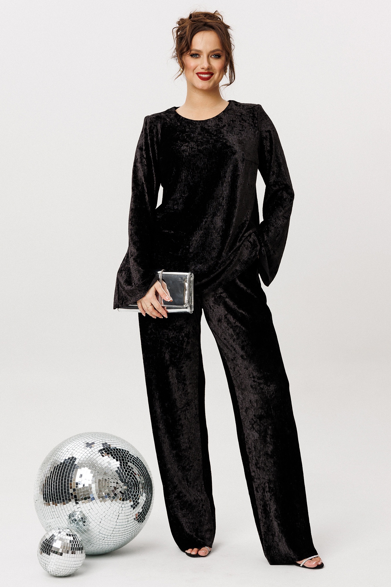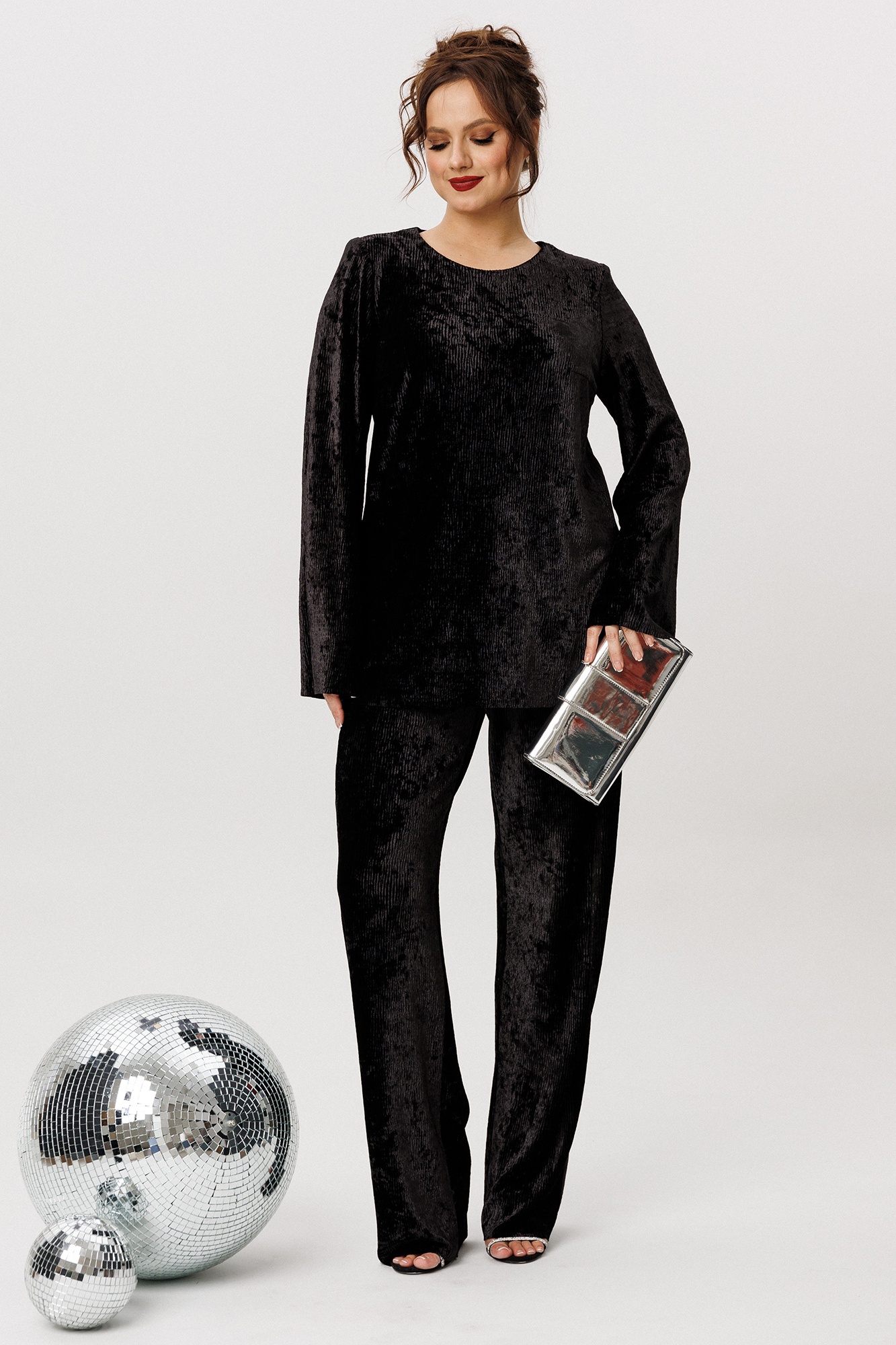 Костюм выполнен из крэш бархата. Блуза свободного силуэта. Горловина округлой формы обработана обтачкой. Рукав втачной, расклешённый к низу. По переду блузы нагрудные выточки, по боковым швам разрезы. Брюки прямого силуэта. Верх брюк на притачном поясе с эластичной тесьмой. В боковых швах карманы с наклонным входом.