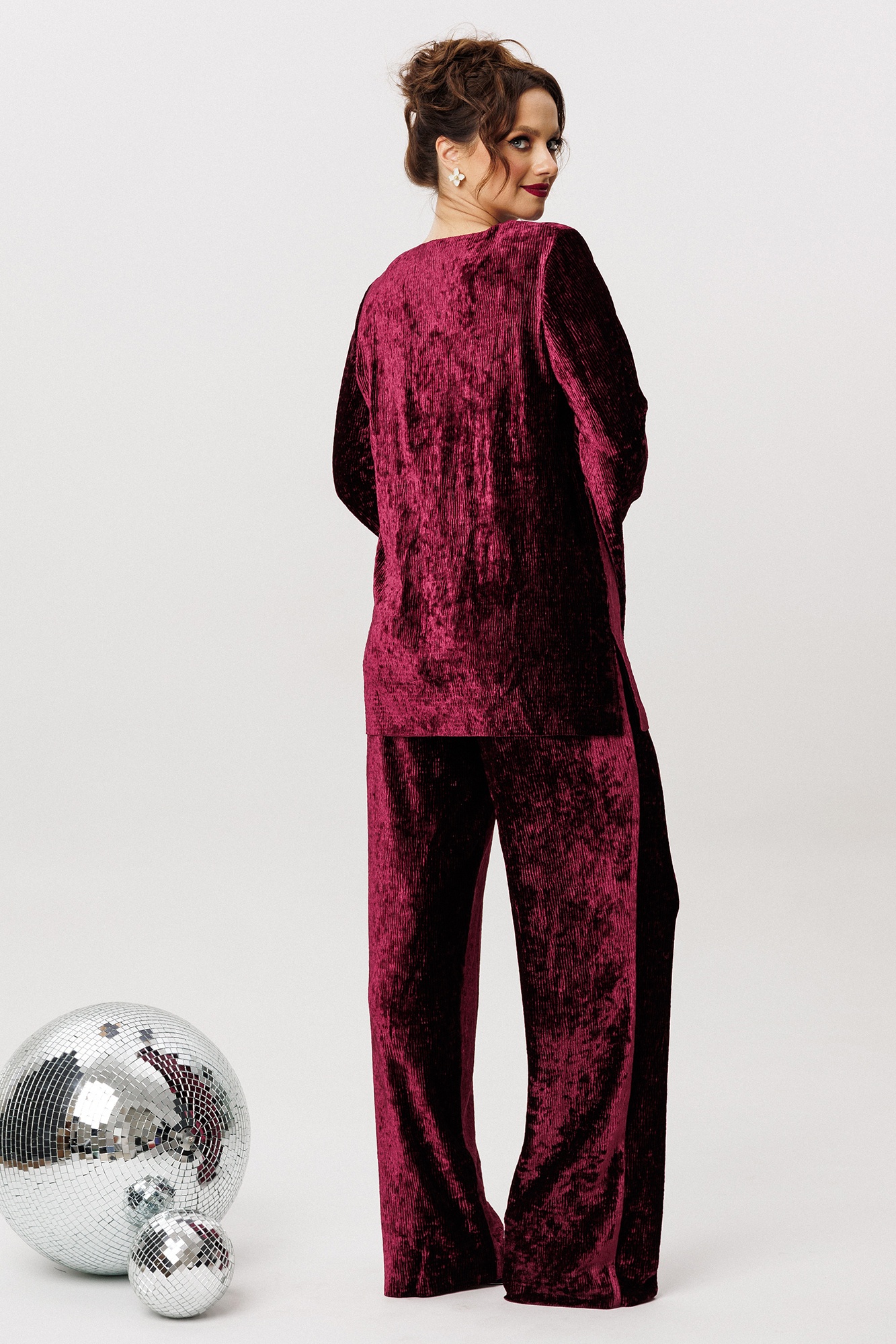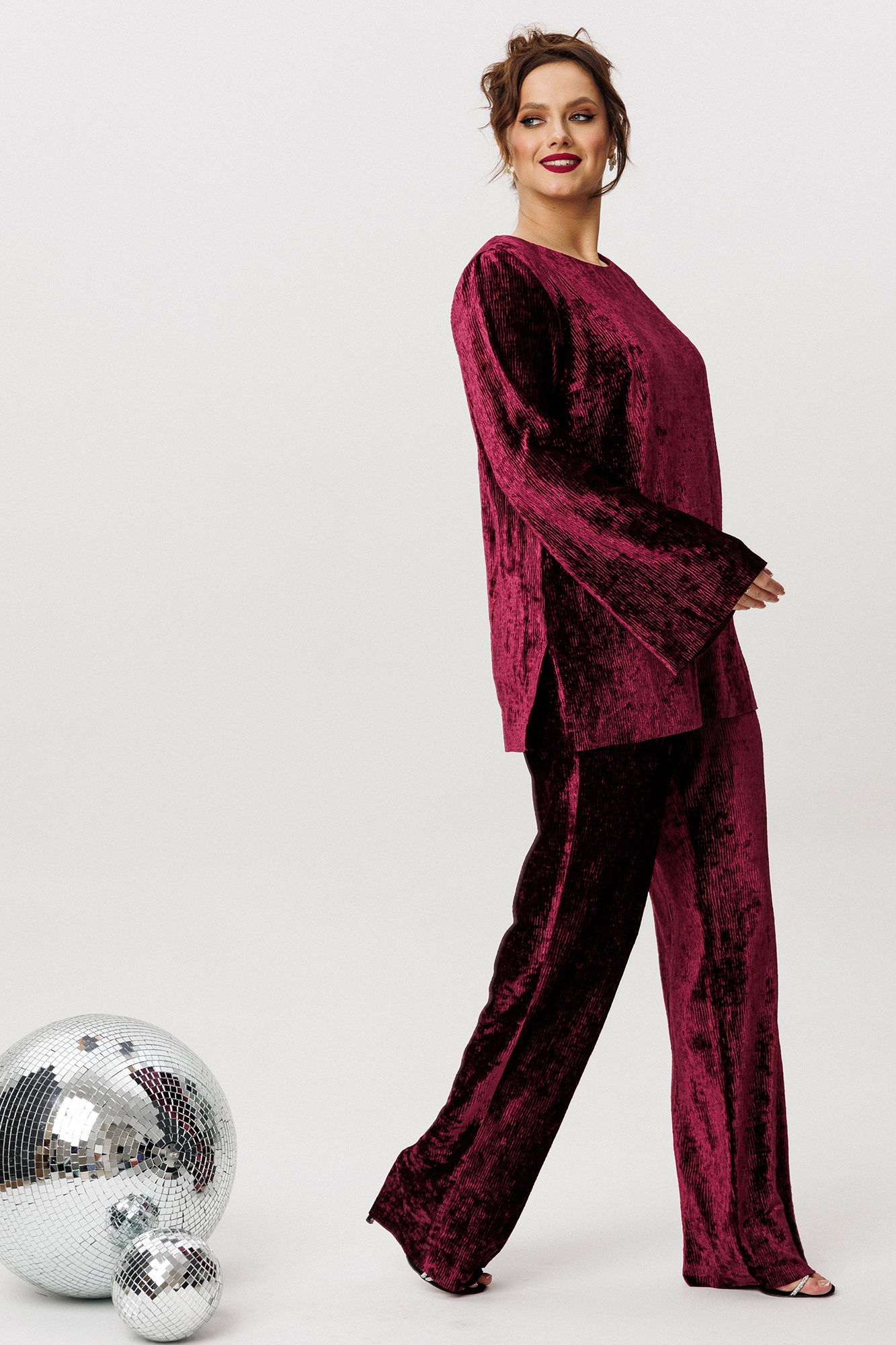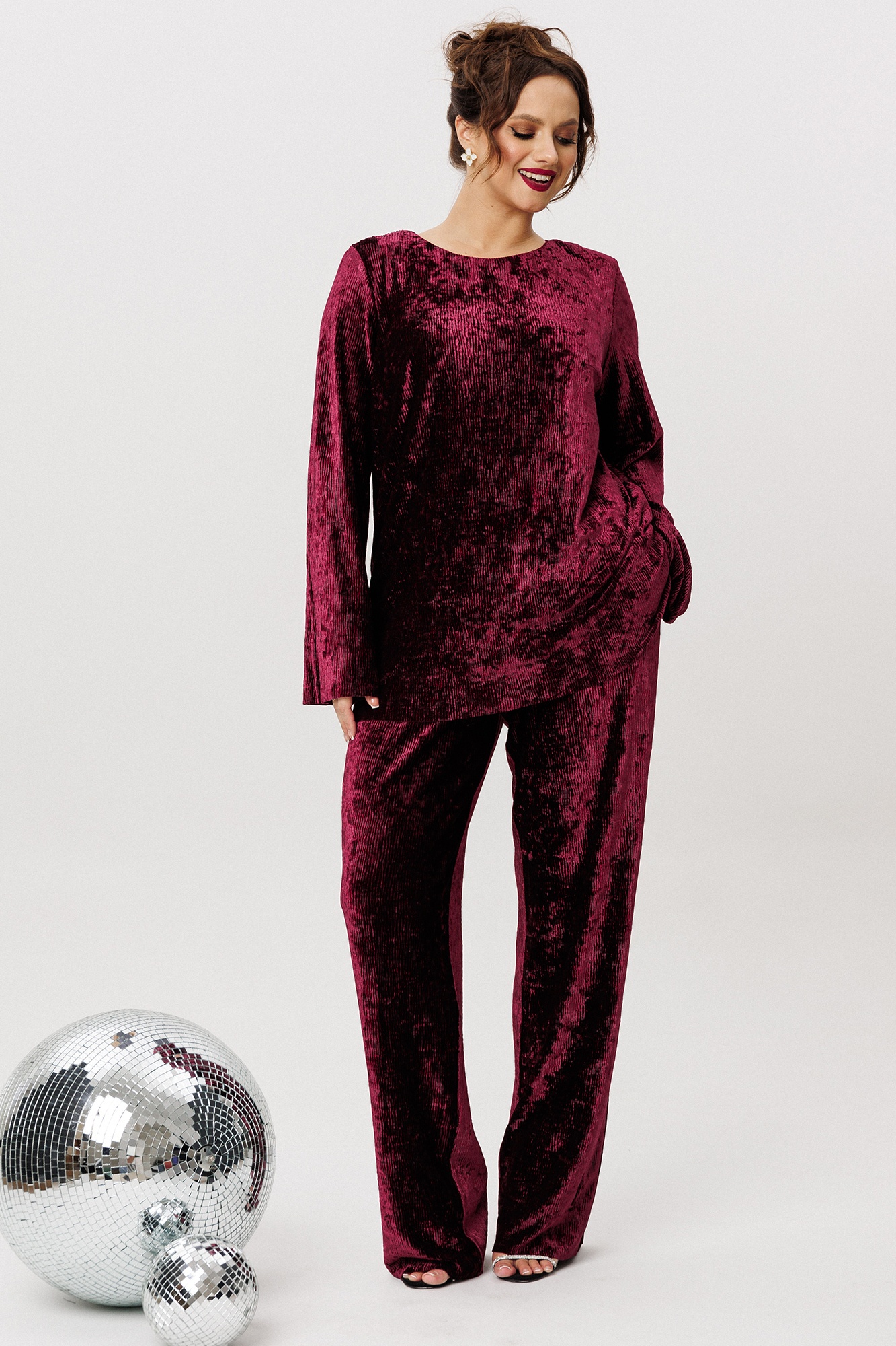 Костюм выполнен из крэш бархата. Блуза свободного силуэта. Горловина округлой формы обработана обтачкой. Рукав втачной, расклешённый к низу. По переду блузы нагрудные выточки, по боковым швам разрезы. Брюки прямого силуэта. Верх брюк на притачном поясе с эластичной тесьмой. В боковых швах карманы с наклонным входом.
