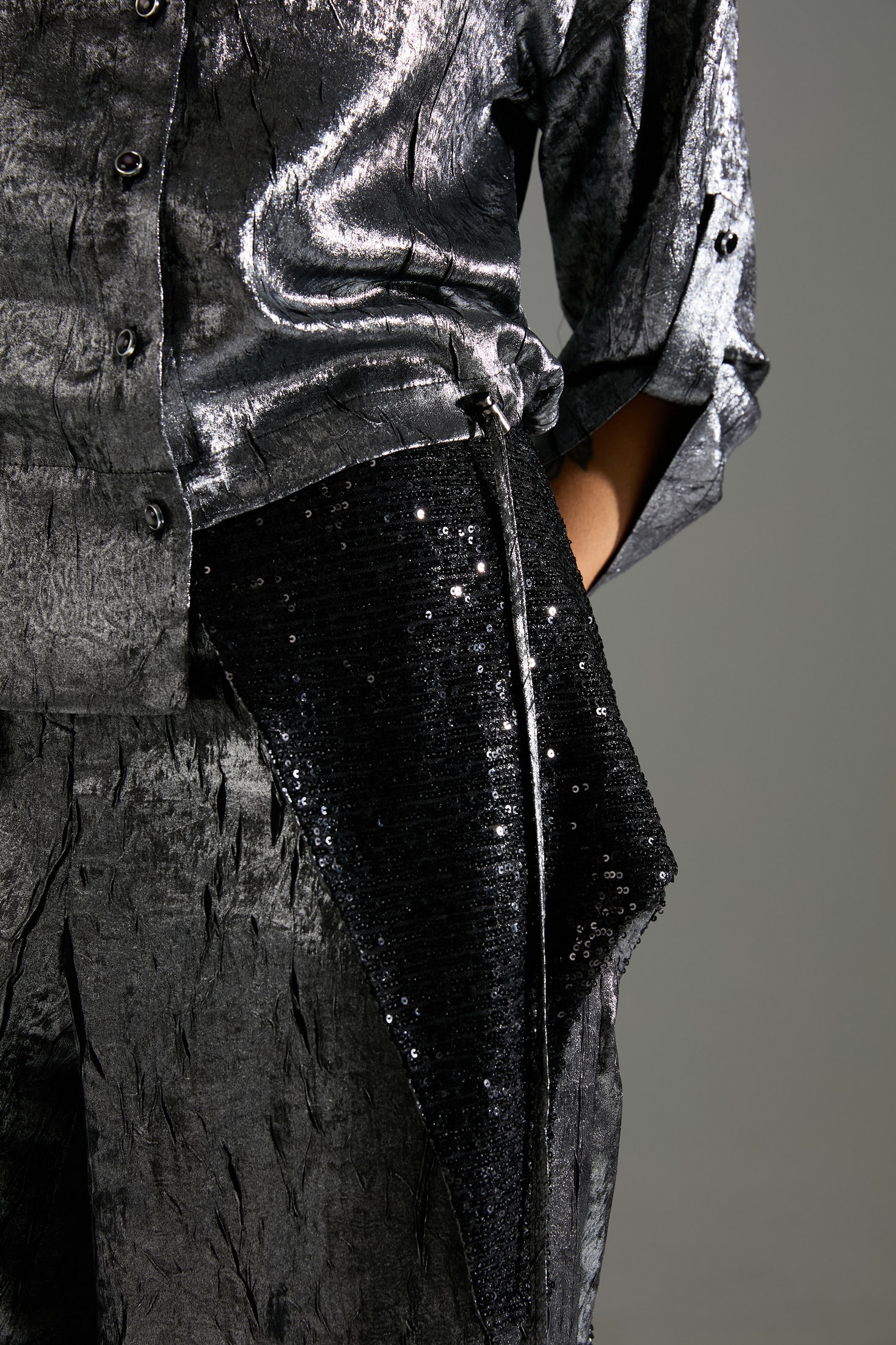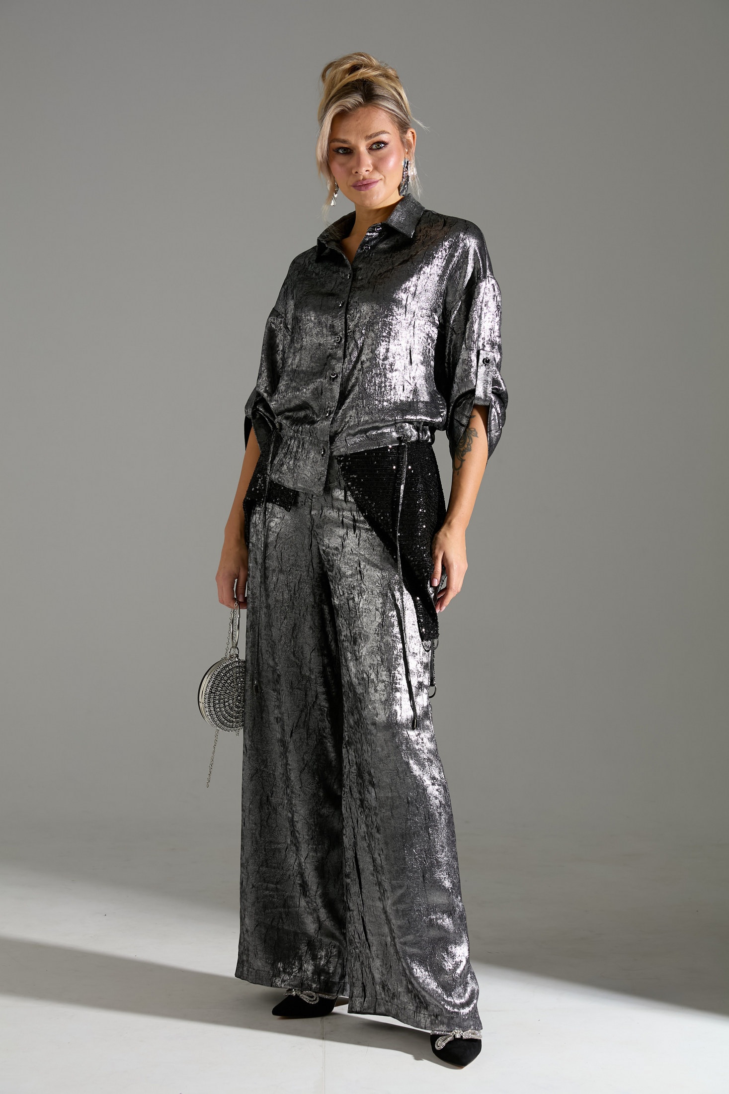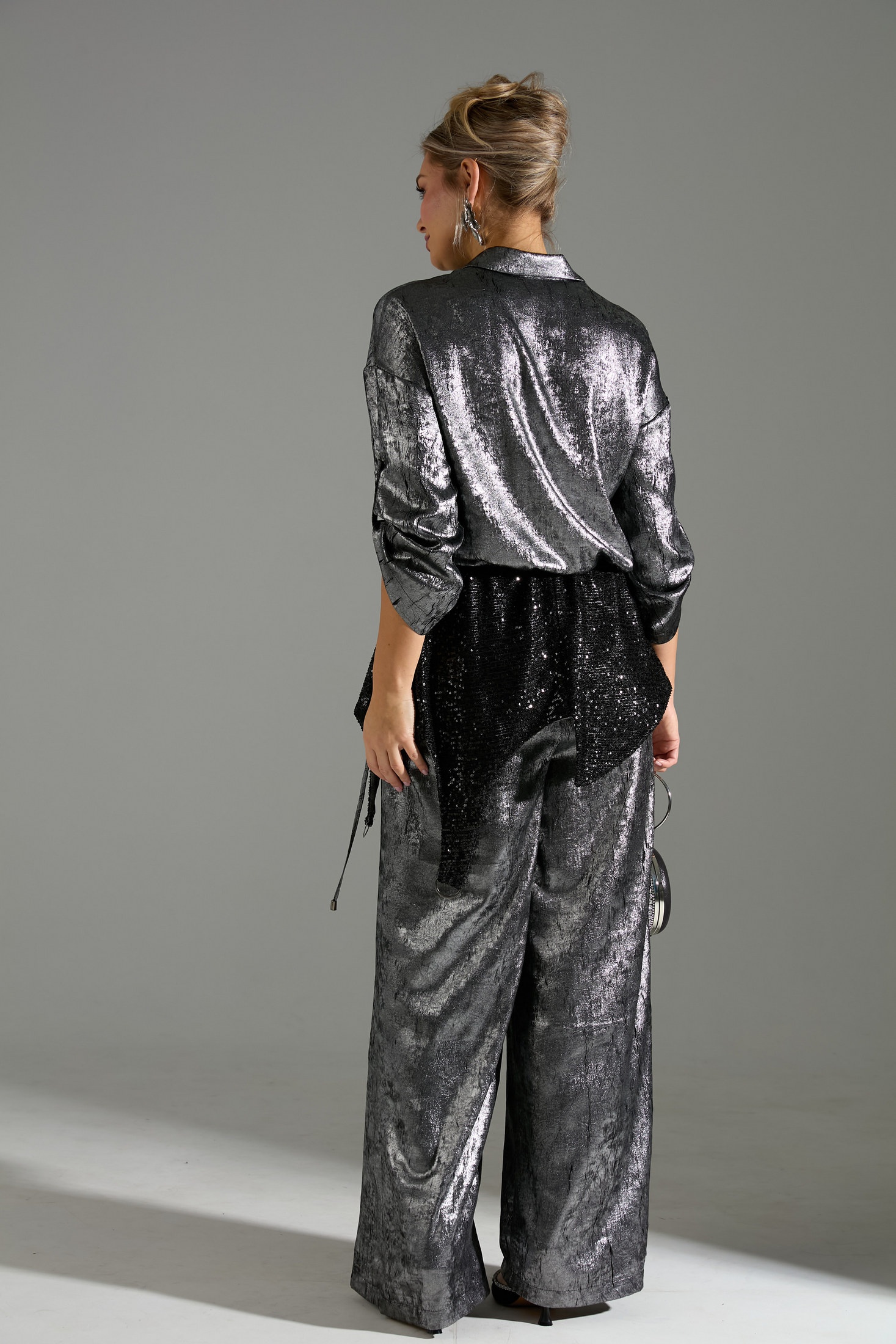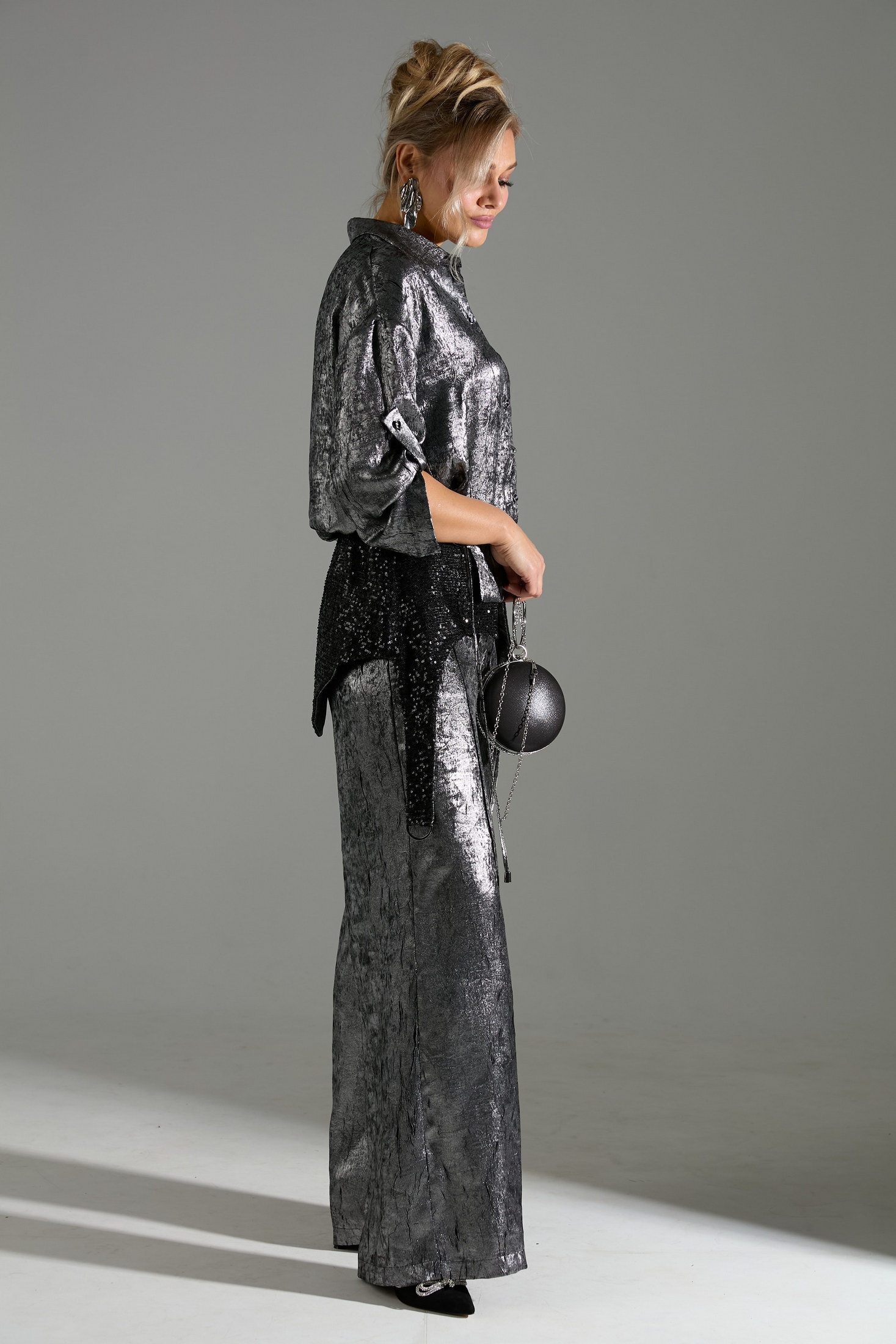 Элегантный женский брючный костюм из двух предметов: рубашки и прямых широких брюк. Рубашка выполнена в объёмном силуэте с длинными рукавами, оснащена пуговицами и шлейками на рукавах с пуговичной застёжкой для регулировки объема. Брюки прямого кроя дополняют образ, создавая лаконичный и современный вид. Особенность костюма – его текстурированный материал с металлическим блеском серебристо-чёрного цвета, который придает изделию роскошный и выразительный характер. Этот костюм идеален для создания стильного вечернего образа.