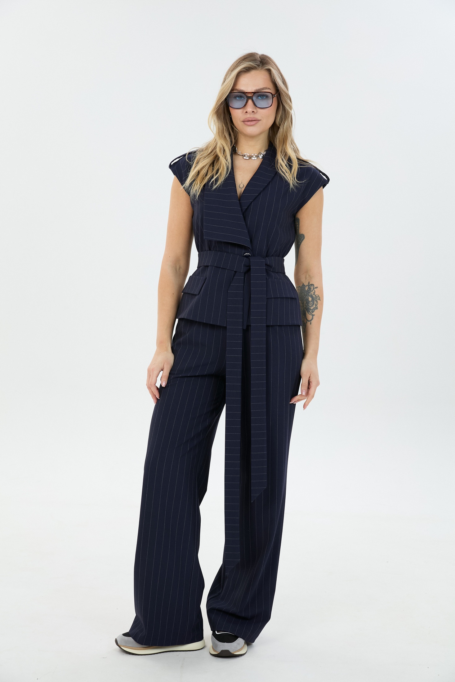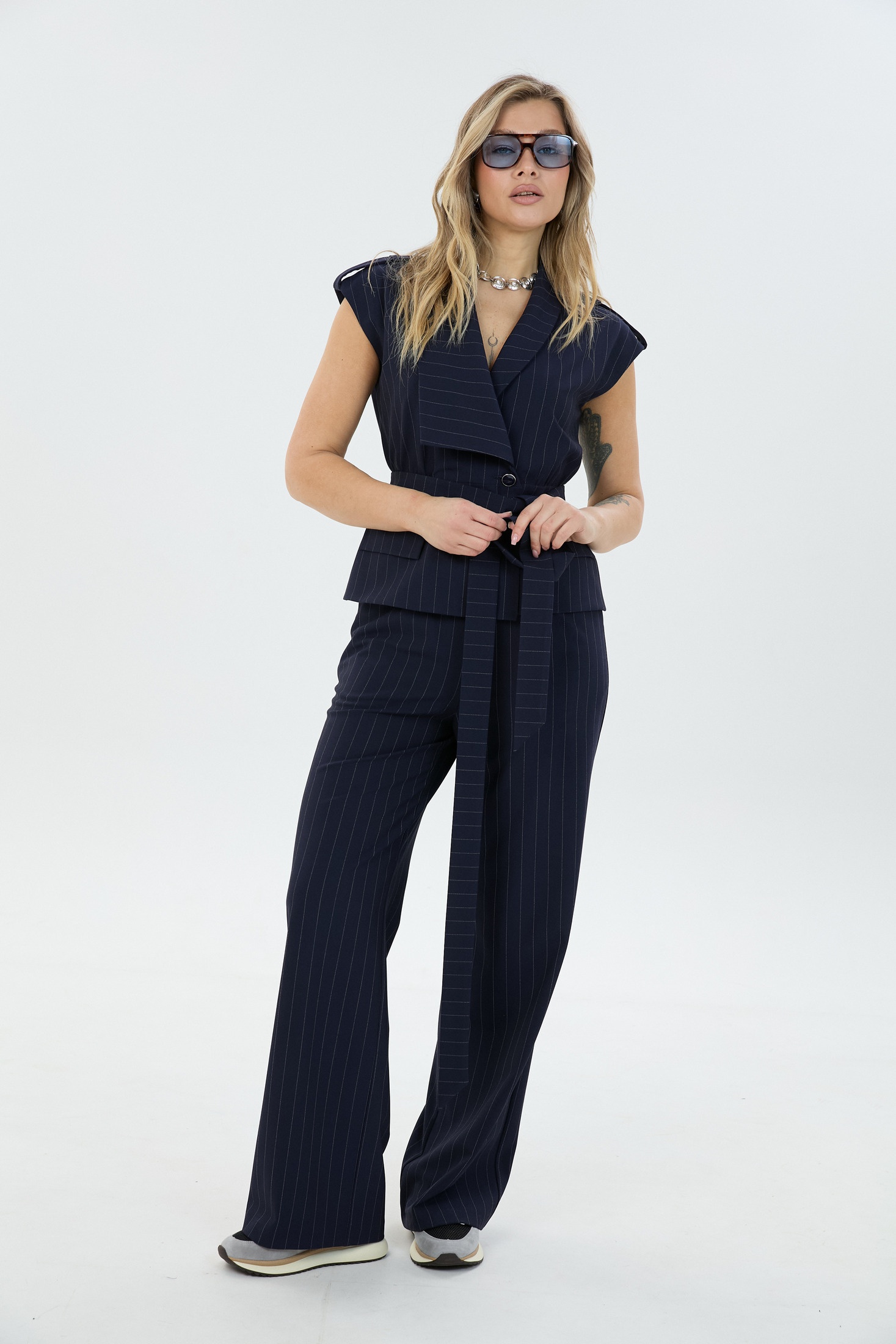 Костюм брючный 126048 синяя полоска LM (Лаборатория моды) — это стильный выбор для современных женщин. Коллекция бренда Лаборатория моды предлагает изысканный комплект, состоящий из элегантного жилета и брюк. Жилет выполнен с отложным воротником и поясом, придающим фигуре стройность. Перед с застёжкой на кнопки и декоративными патами на плечах. Брюки прямого силуэта с эластичной резинкой на талии и наклонными карманами для удобства. Материал состоит из вискозы, полиэстера и лайкры, что обеспечивает комфорт и легкость движений. Классический стиль костюма с полосатым узором делает его идеальным для весенне-летнего сезона и офисных будней. Синий цвет добавляет утонченности и современности.