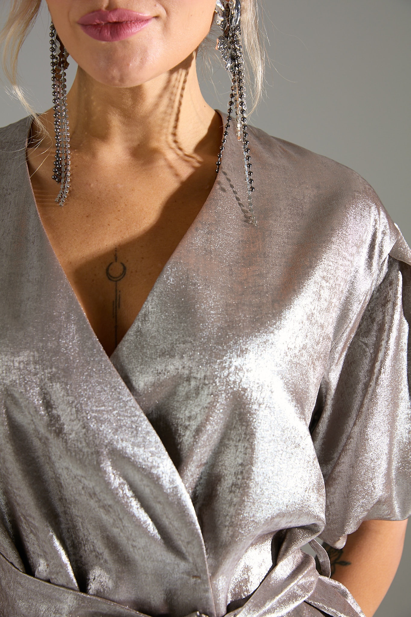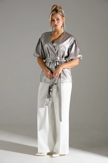 Комплект 2ка, состоящий из жакета и брюк. Легкий жакет на подкладке с объёмными рукавами. Перед на запах без застежки, под пояс по талии.