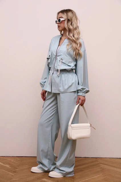 Костюм 2ка, состоящий из кофты и брюк. Кофта в спортивном стиле на молнии. Талия и низ рукавов на резинке . По переду располжены накладные карманы склапанами.На клапанах люверсы. Жакет дополнен декоративными цепочками. Свободные брюки прямого силуэта, талия на резинке. В боковых швах расположены карманы. На правой брючине расположен боковой накладной карман с клапаном. СОВЕТ ОТ СТИЛИСТА: Брюки и кофту от костюма легко носить как вместе раздельно, цвет хорошо сочетается со всеми пастельными мягкими оттенками.Под кофту хорошо подойдут зауженные к низу белые брюки, а брюки можно надеть с футболкой в жаркий день.