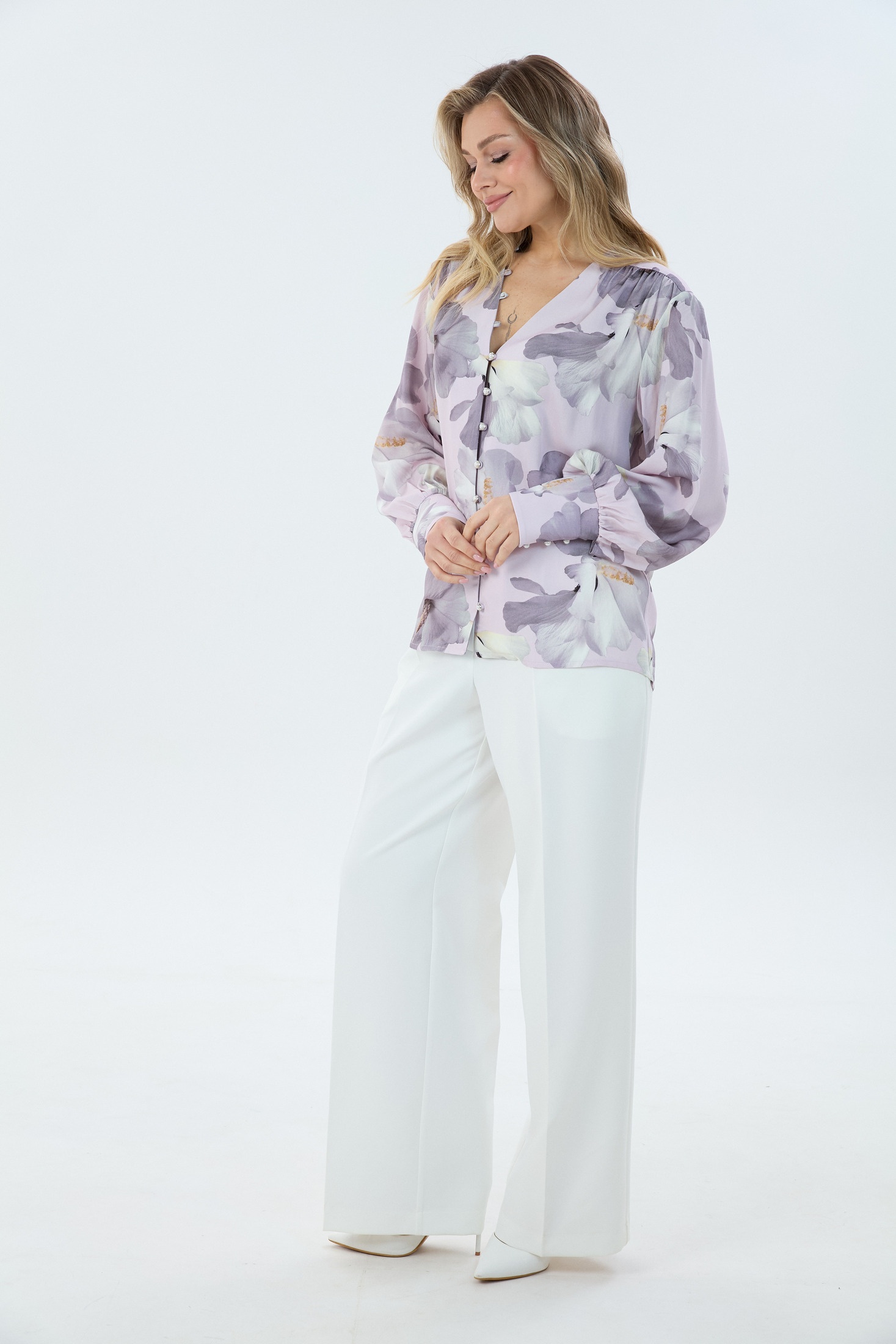 Костюм брючный К1940148 сиреневый LM (Лаборатория моды) — это стильный выбор для современного гардероба. Коллекция бренда Лаборатория моды предлагает изящный комплект, состоящий из блузки и брюк. Блузка выполнена из 100% вискозы с нежным цветочным принтом и имеет V-образный вырез, который акцентирует декольте. Длинные объёмные рукава заканчиваются широкой манжетой с пуговицами и петлями. Брюки из хлопковой джинсовой ткани свободного кроя, с молнией и пуговицей, а также с функциональными карманами спереди и сзади. Сиреневый цвет дополняет свежий и женственный стиль. Идеально подходит для весенне-летнего сезона и станет отличным выбором для повседневного ношения.