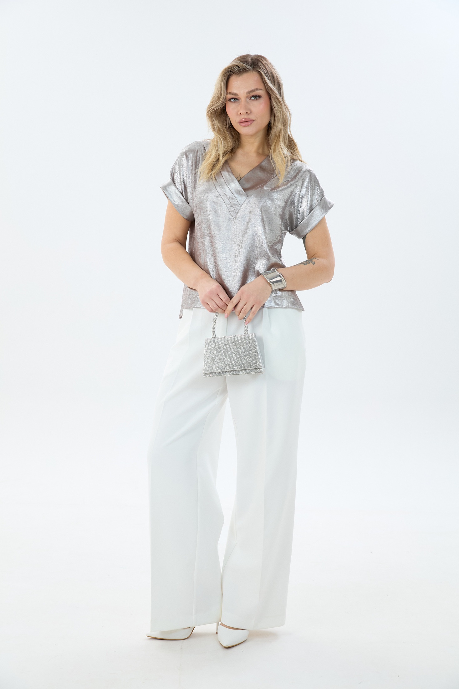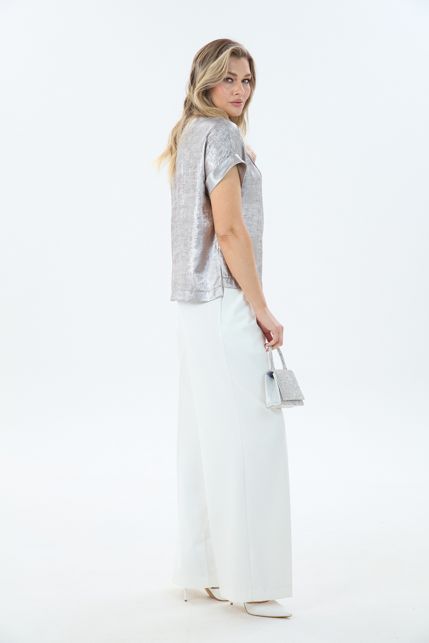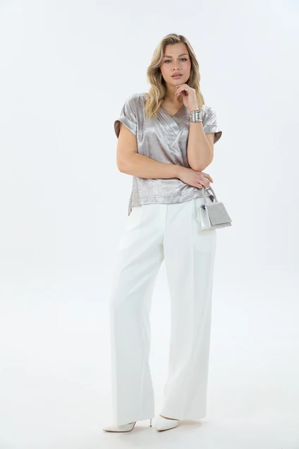 Костюм брючный К194092 шиммер LM (Лаборатория моды) предлагает уникальное сочетание стиля и комфорта. Коллекция бренда Лаборатория моды создана для современных женщин, ценящих утонченность и практичность. Комплект 2ка включает в себя блузку и брюки. Блузка выполнена из ткани с вискозной изнанкой и блестящей лицевой стороной, дополнена V-образной горловиной и модными подворотами на рукавах. Брюки из хлопковой джинсовой ткани с удобной застежкой на молнию и пуговицу, свободного кроя от бедра, обеспечат комфорт в течение всего дня. Карманы на передней и задней части брюк — практичная деталь. Костюм идеально подходит для весенне-летнего сезона, добавит вашему образу легкость и стиль. Серебристый оттенок блузки и белый цвет брюк делают его универсальным для различных повседневных и деловых мероприятий.