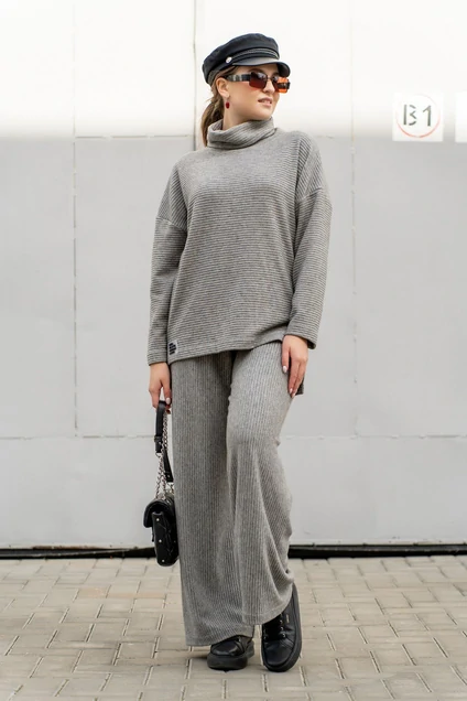 Костюм(джемпер и брюки) из трикотажного полотна.Джемпер прямого силуэта с вортником,разрезами в боковых швах.Брюки высокой посадки на резинке,без боковых швов. длина -75см, дл.рукава-58 см дл.брюк-108см