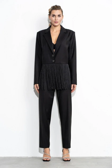 Костюм(жакет и брюки).Жакет прямого силуэта с центральной застёжкой на петли-пуговицы, на подкладке, с декоративной трендовой тесьмой.Рукава втачные с имитацией шлицы ,с пуговицами.Брюки высокой посадки на поясе с застёжкой на тесьму-молнию и петлю-пуговицу,по спинке в поясе-резинка. длина брюк по боковому шву с поясом -98 см,длина жакета-78см