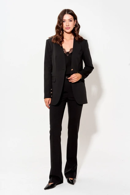 Стильный жакет полуприлегающего силуэта из костюмной ткани. Рукав втачной двухшовный, по низу в переднем шве рукава декоративная шлица с декоративными пуговицы. Жакет с V-образным вырезом и застежкой по центру на петлю и пуговицу. По переду и спинке талиевые вытачки. По переду карман в рамку с клапаном. Обращаем ваше внимание, что фурнитура может незначительно отличаться от фото.