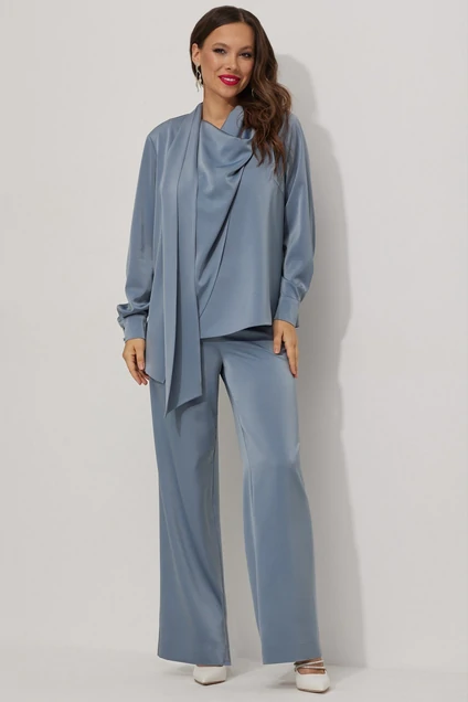 Элегантный комплект из блузы и брюк, выполненных из струящейся ткани средней плотности с атласным блеском. Блуза свободного кроя со слегка спущенным рукавом, дополненным притачной манжетой с застежкой на красивые пришивные пуговицы. Блуза дополнена притачным элементом, который драпируется вокруг горловины с помощью пришивных шлевок. По спинке застежка "капелька" на пришивную пуговицу. Брюки прямого кроя с притачным поясом, дополненным эластичной тесьмой. Застежка на потайную молнию и пуговицу. Длина блузы от плечевого шва 64см. Длина рукава 61см. Длина брюк 109см.
