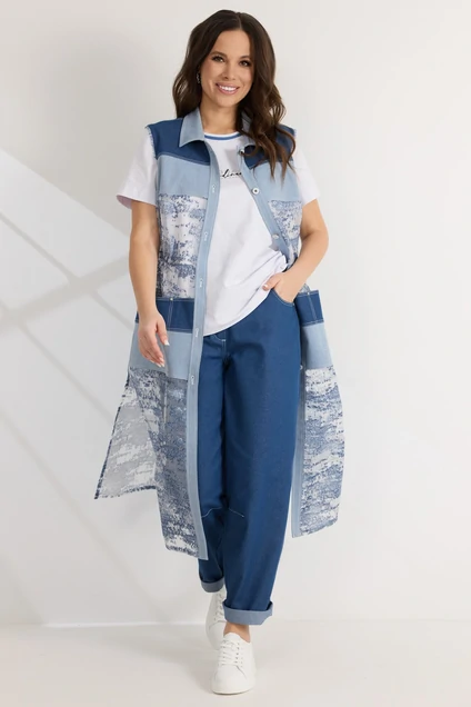 Стильный комплект из удлиненного жилета, футболки и брюк. Жилет свободного прямого кроя с центральной застежкой на металлические пуговицы. Выполнен из органзы с принтом в сочетании с джинсом. Жилет дополнен функциональными карманами. В боковых швах расположены разрезы. По талии расположена скрытая кулиска с эластичной тесьмой и фиксаторами. Футболка свободного прямого кроя с втачным рукавом. Дополнена красивой термо аппликацией. Брюки свободного кроя, слегка заужены книзу. Посадка средняя. Пояс притачной, дополнен эластичной тесьмой. Брюки дополнены удобными боковыми и задними карманами. Застежка гульфик на молнию и металлическую пуговицу. Выполнены из джинса. Длина жилета от плечевого шва 121см Длина футболки от плечевого шва62см. Длина брюк по боковому шву 96см.