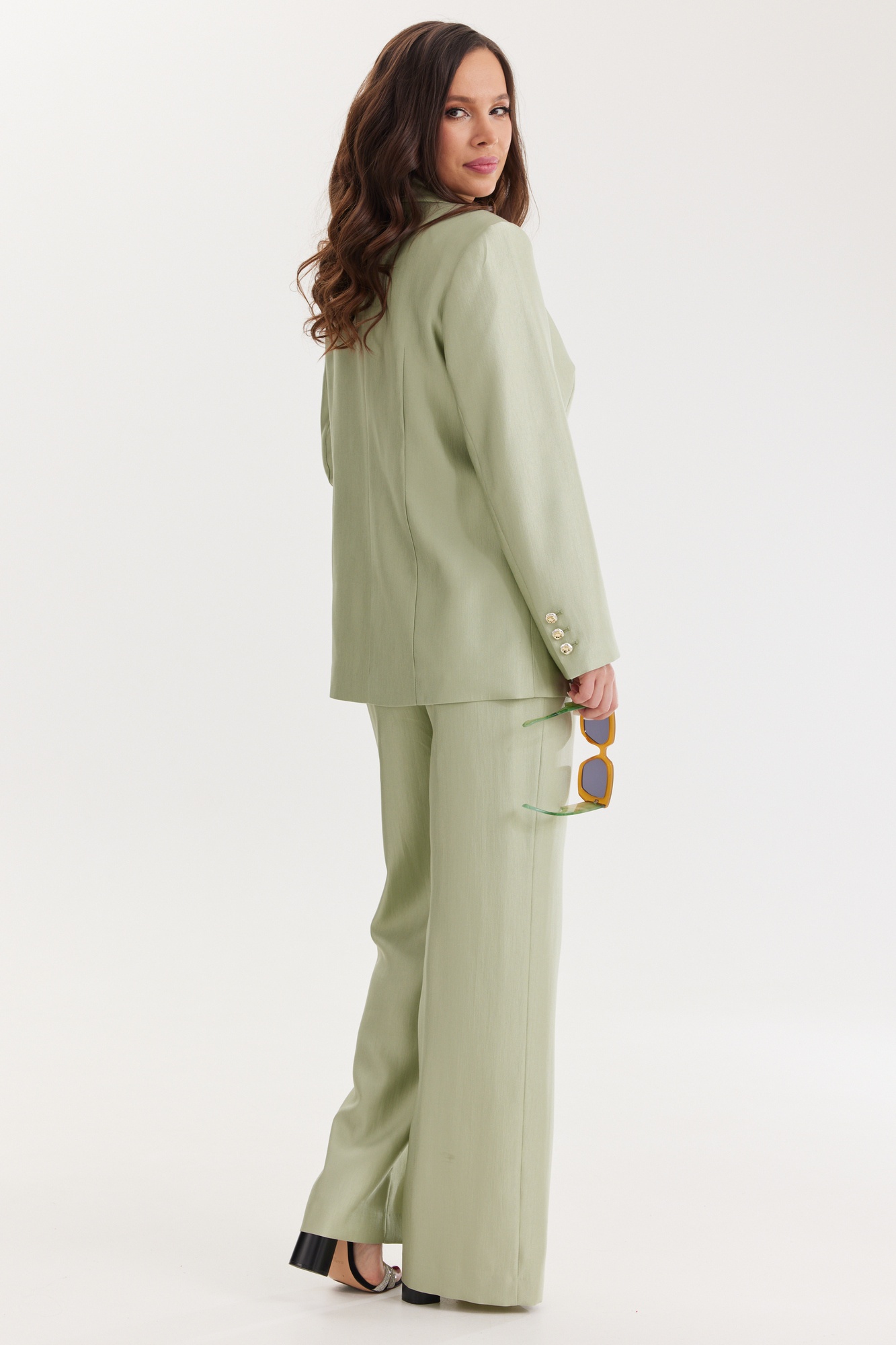 Костюм брючный 2659 салатовый Магия Моды из коллекции бренда Магия Моды пленяет своим классическим дизайном и современным подходом. Выполнен из гладкой вискозной ткани с лёгким жемчужным блеском, костюм идеально подходит для весеннего и летнего сезонов. Жакет с длиной от плечевого шва 73 см дополнен элегантной центральной застежкой на пуговицы и удобными карманами. Брюки классического кроя с длиной 107 см и эластичным поясом обеспечивают комфорт и свободу движений. Салатовый цвет добавляет свежести образу, делая его идеальным выбором для деловых встреч или повседневных прогулок. Длина жакета от плечевого шва 73 см. Длина рукава 60 см. Длина брюк 107 см