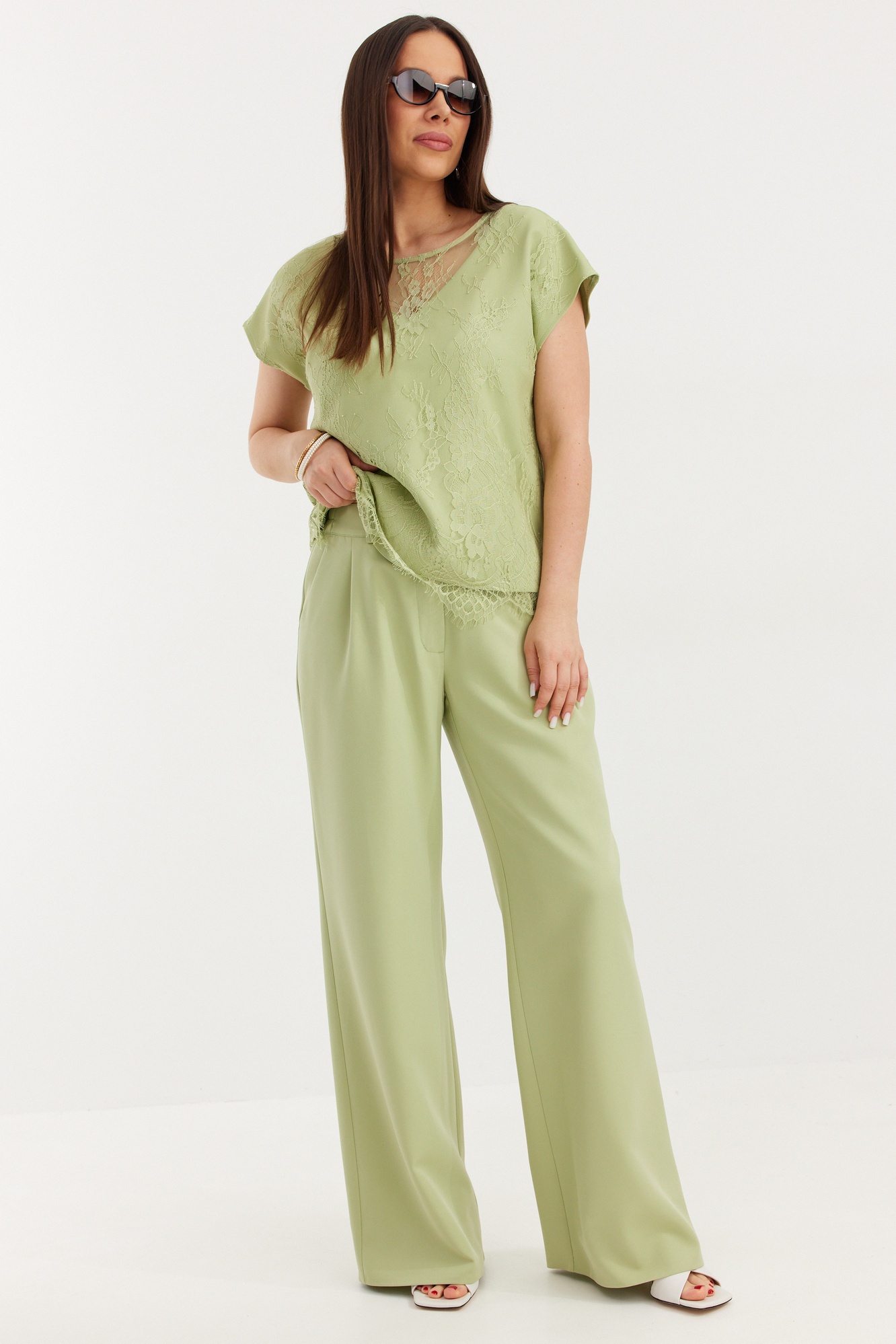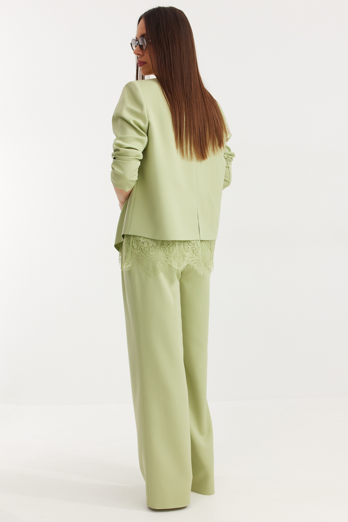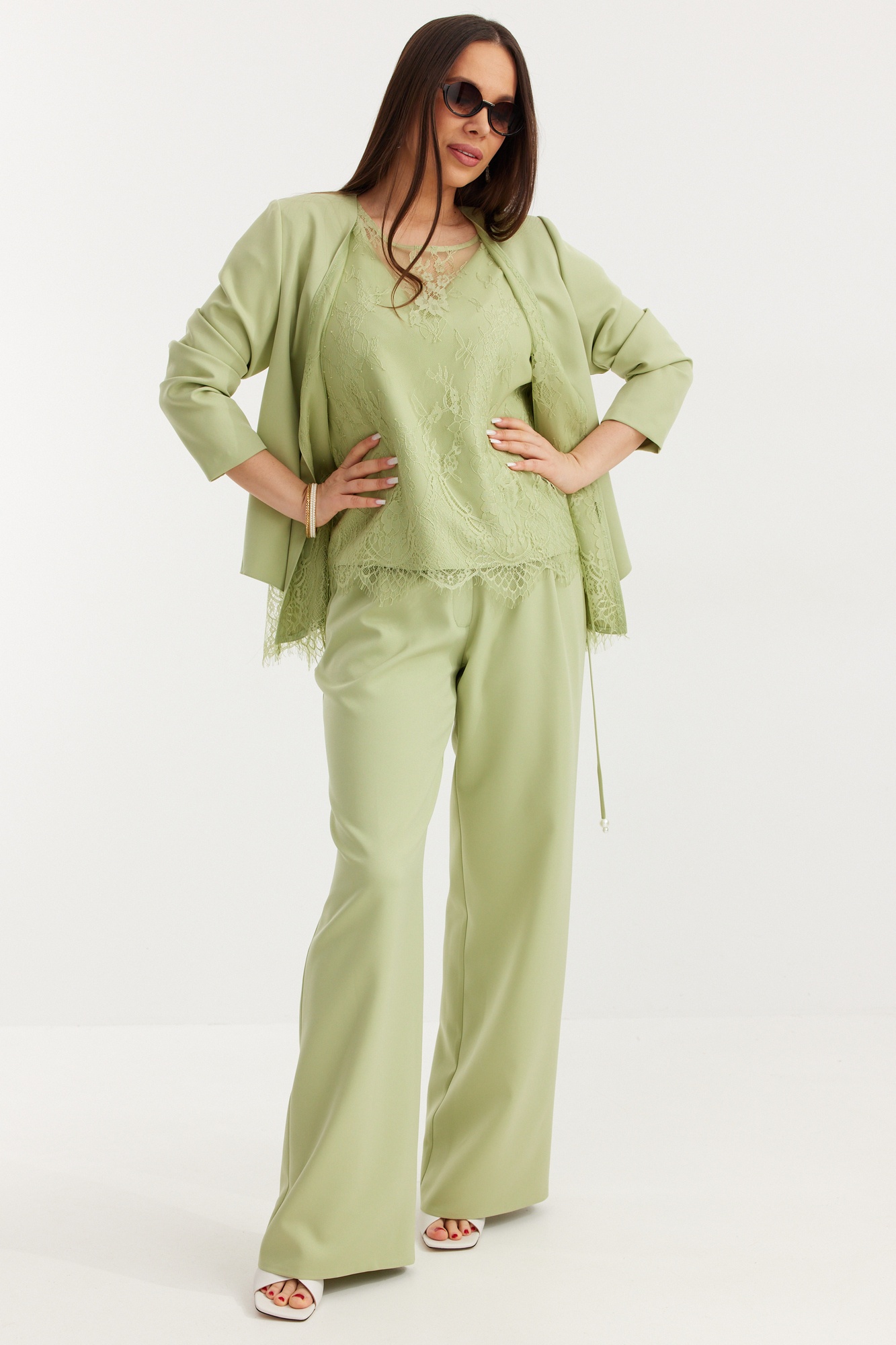 Костюм брючный 2709 фисташковый Магия Моды из коллекции бренда предлагает уникальное сочетание комфорта и стиля. Комплект состоит из кардигана, блузы и брюк, выполненных из мягкой летней костюмной ткани с добавлением нежного кружева. Свободный кардиган с завязкой бантик и изнанкой из кружева создают лёгкость и женственность. Блуза имеет короткий рукав и свободный крой, обеспечивая комфорт в тёплые дни. Классические брюки с молнией и пуговицей, дополнены боковыми карманами и эластичной тесьмой на поясе. Свежий фисташковый цвет добавляет модное звучание, а длина изделия делает акцент на утончённость. Длина кардигана 61 см, длина рукава 60 см, длина блузы 66 см и длина брюк 105 см позволяют идеально подчеркнуть фигуру. Этот комплект идеален для летнего офиса или деловых встреч.