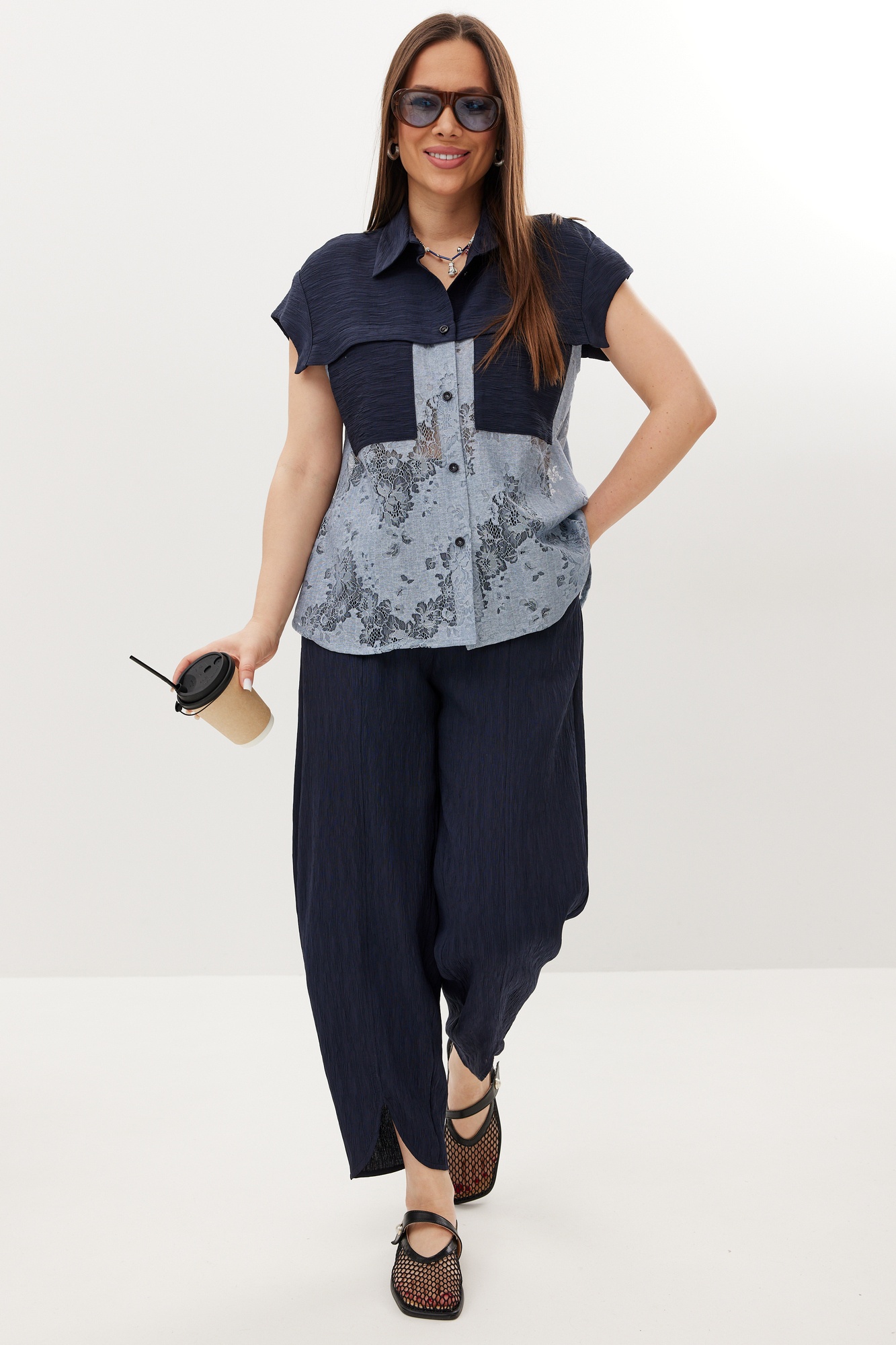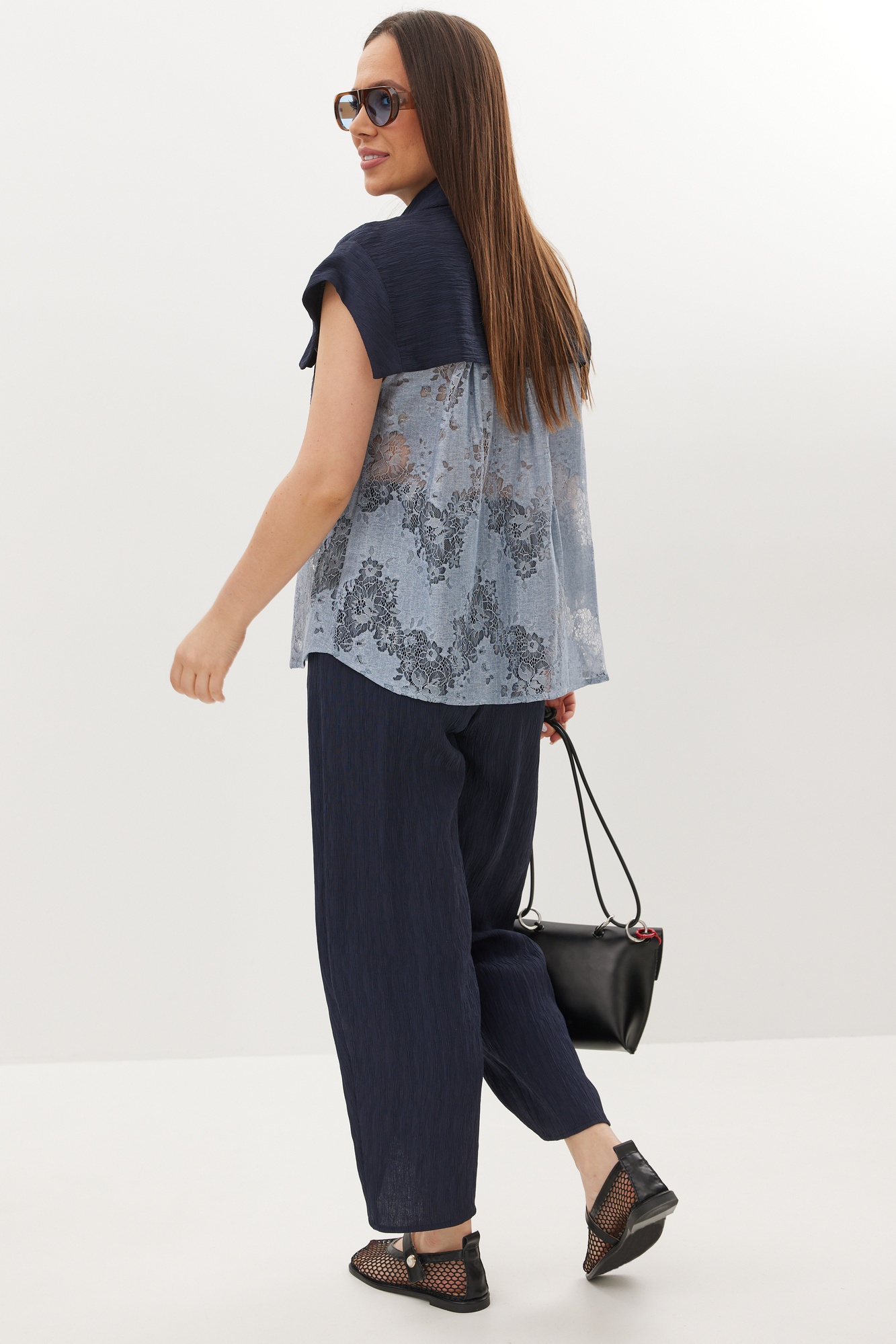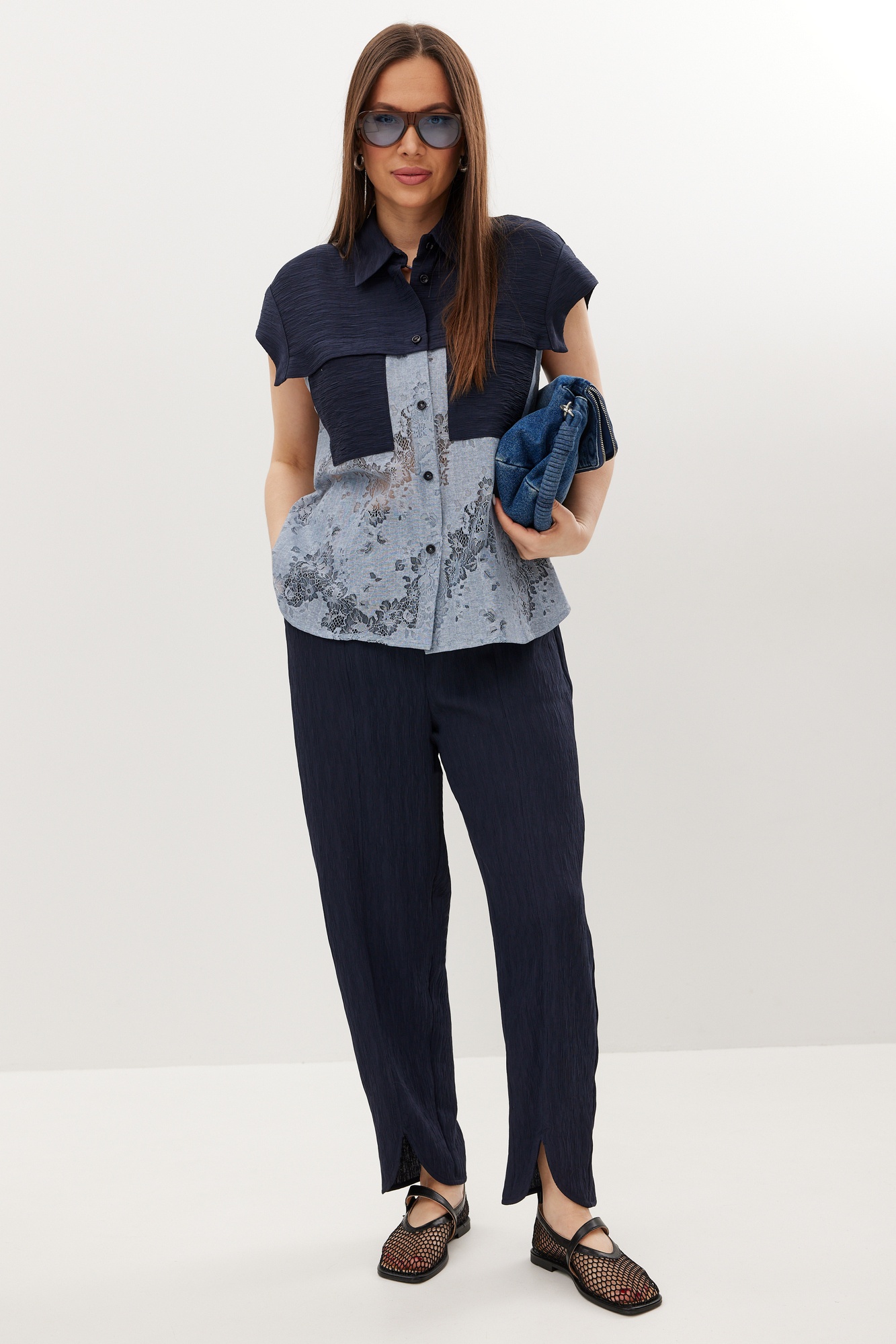 Костюм брючный 2713 Магия Моды — отличный выбор для современного гардероба. Коллекция бренда Магия Моды предлагает стильный комплект, состоящий из блузы и брюк. Блуза выполнена из комбинации натуральной фактурной ткани и нежного кружева, придающего образу изысканность. Свободный рубашечный крой и центральная застежка на пуговицы обеспечивают комфорт и легкость в движении. Брюки имеют свободный крой с притачным поясом и эластичной тесьмой, а также оснащены удобными боковыми карманами. Они слегка заужены книзу и дополнены стильным вырезом. Комплект идеально подходит для тёплого весенне-летнего сезона. Его универсальная синяя цветовая гамма легко комбинируется с аксессуарами. Длина блузы от плечевого шва — 65 см, длина рукава — 14 см, длина брюк по боковому шву — 97 см.