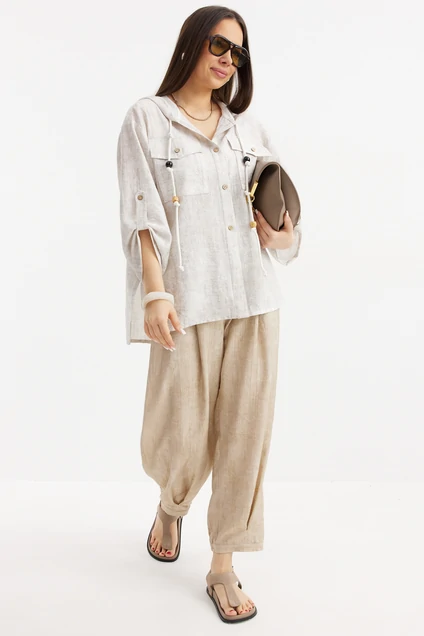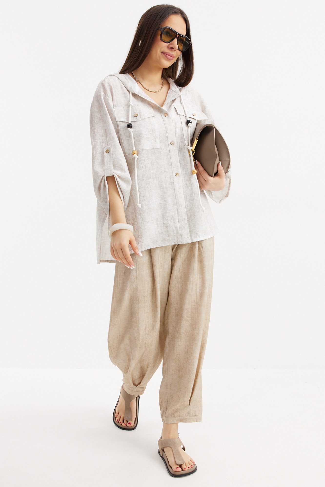 Костюм брючный 2716 беж Магия Моды — это идеальное решение для повседневного образа. Коллекция бренда Магия Моды предлагает стильный комплект, включающий блузу и брюки, выполненные из легкой и приятной к телу поливискозной ткани с эффектом жатки. Блуза свободного рубашечного кроя дополнена капюшоном и декоративным шнуром с бусинами, застёгивается на пришивные пуговицы. Удобство регулировки рукавов обеспечивается патой с пуговицей. Длина блузы от плечевого шва составляет 72 см, а длина рукава — 55 см. Брюки свободного кроя с притачным поясом и эластичной тесьмой, застегиваются на молнию и пуговицу, присборены по низу. Карманы добавляют практичности. Длина брюк — 96 см. Теплый бежевый цвет и функциональные детали делают этот костюм отличным выбором для сезона весна-осень.