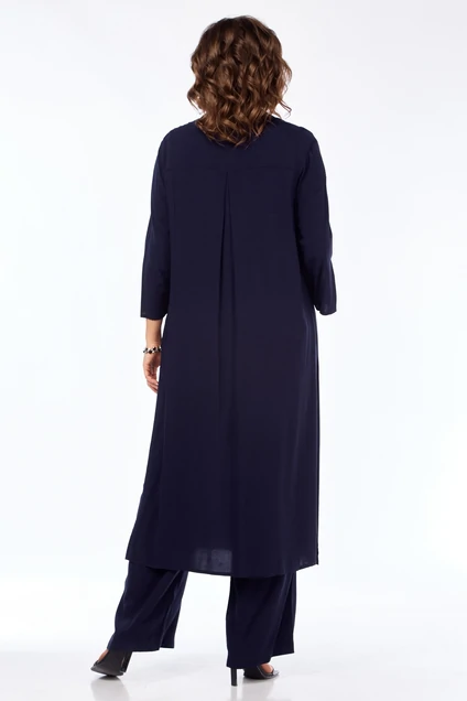 Элегантный женский костюм из трёх предметов в тёмно-синем оттенке. Костюм включает в себя блузку с расширенной горловиной и стильными спущенными плечами, обеспечивающими непринужденный силуэт. Жакет длинный с рукавом 3/4, втачными и дополнен разрезами по низу, что добавляет изысканности. Прямые брюки с боковыми карманами и поясом на эластичной резинке обеспечивают удобство и практичность. Данный комплект идеально подойдет как для официальных мероприятий, так и для повседневной носки, добавляя шарм и утонченность в базовый гардероб.