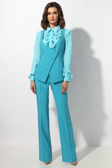 Комплект женский состоит из жилета,брюк и блузки. Жилет(на подкладке) полуприлегающего силуэта с застежкой на петли пуговицы.Брюки классической посадки на притачном поясе с застежкой на тесьму молния, от колена расширенные к низу.Блузка полуприлегающего силуэта с отрезной планкой на полочке и застежкой на петли - пуговицы.По плечевому шву отрезная кокетка со сборкой.На полочке и на рукавах рюша.Рукав втачной , низ обработан манжетой с застежкой на петли - пуговицы.В размерахт 46-48-50: Длина блузки 60 см. Длина рукава 59 см. Длина жилета 36см (от бретели ),от плечевого шва 61см. Длина брюк 107см.В размерахт 52-54: Длина блузки 62 см. Длина рукава 60 см. Длина жилета 37,5см (от бретели ),от плечевого шва 63,5см. Длина брюк 107см.Состав блузки :ПЭ 100%.Подойдет на рост 164-170 см.Цвет блузки :аквамарин.Цвет основной ткани :ярко-голубой
