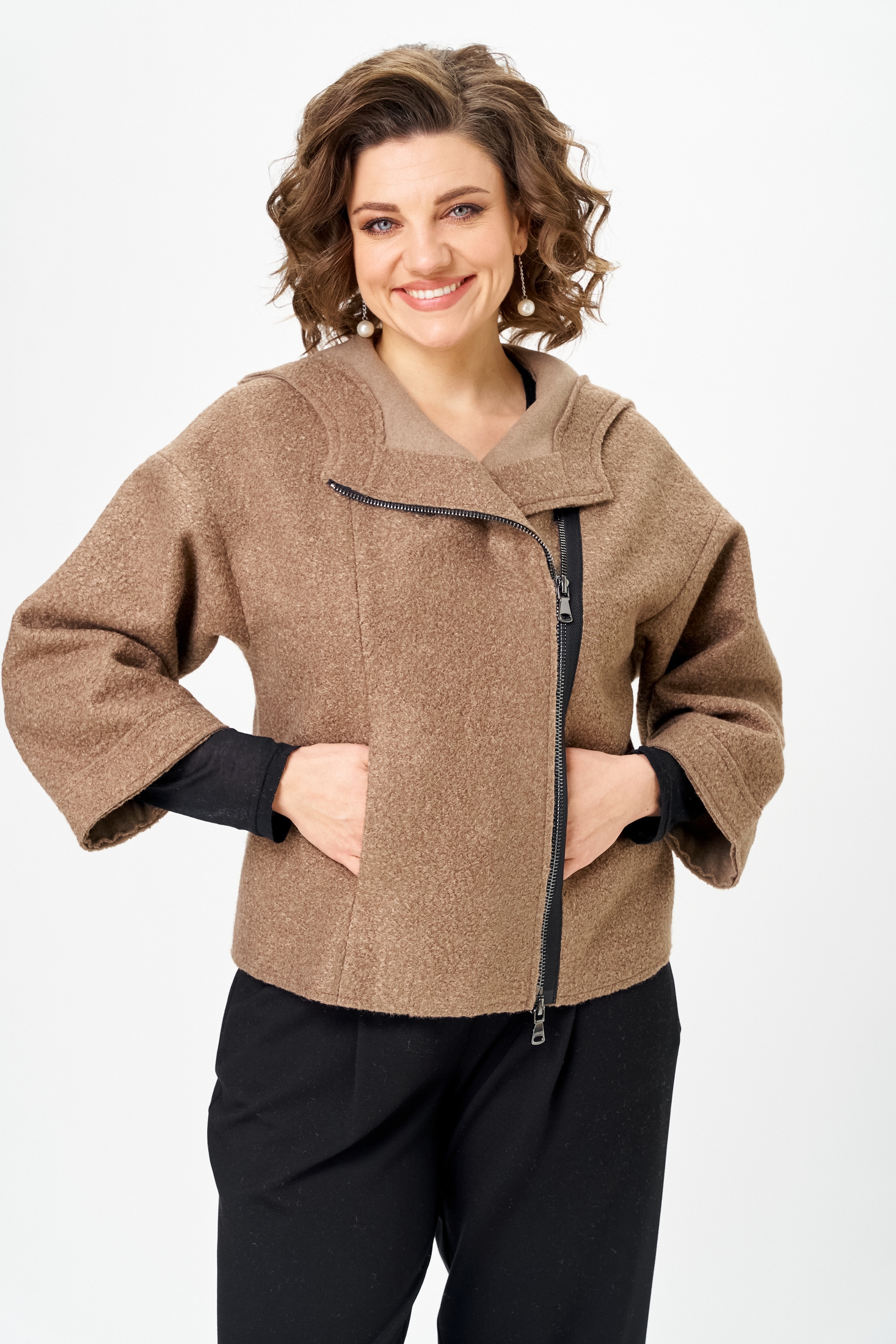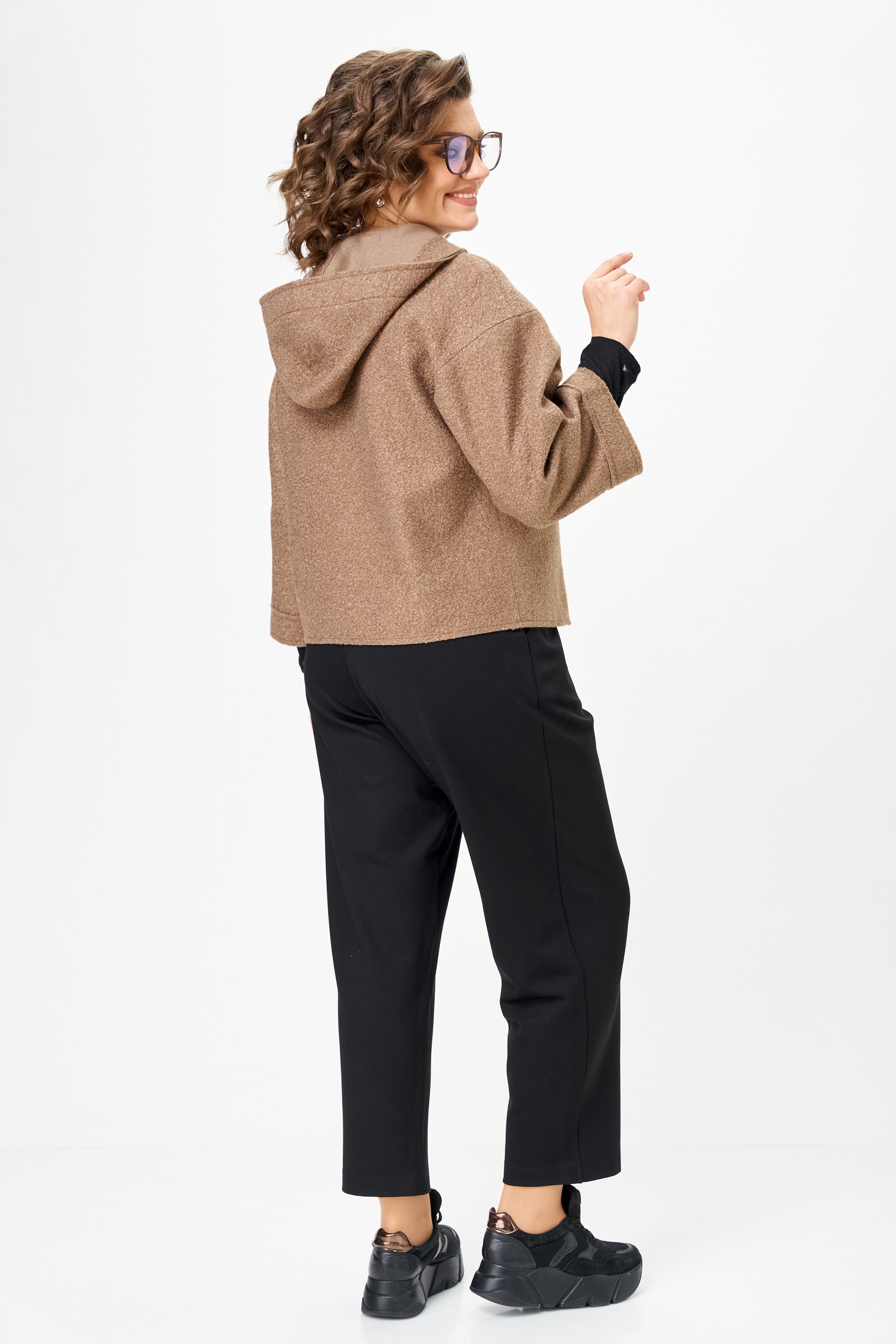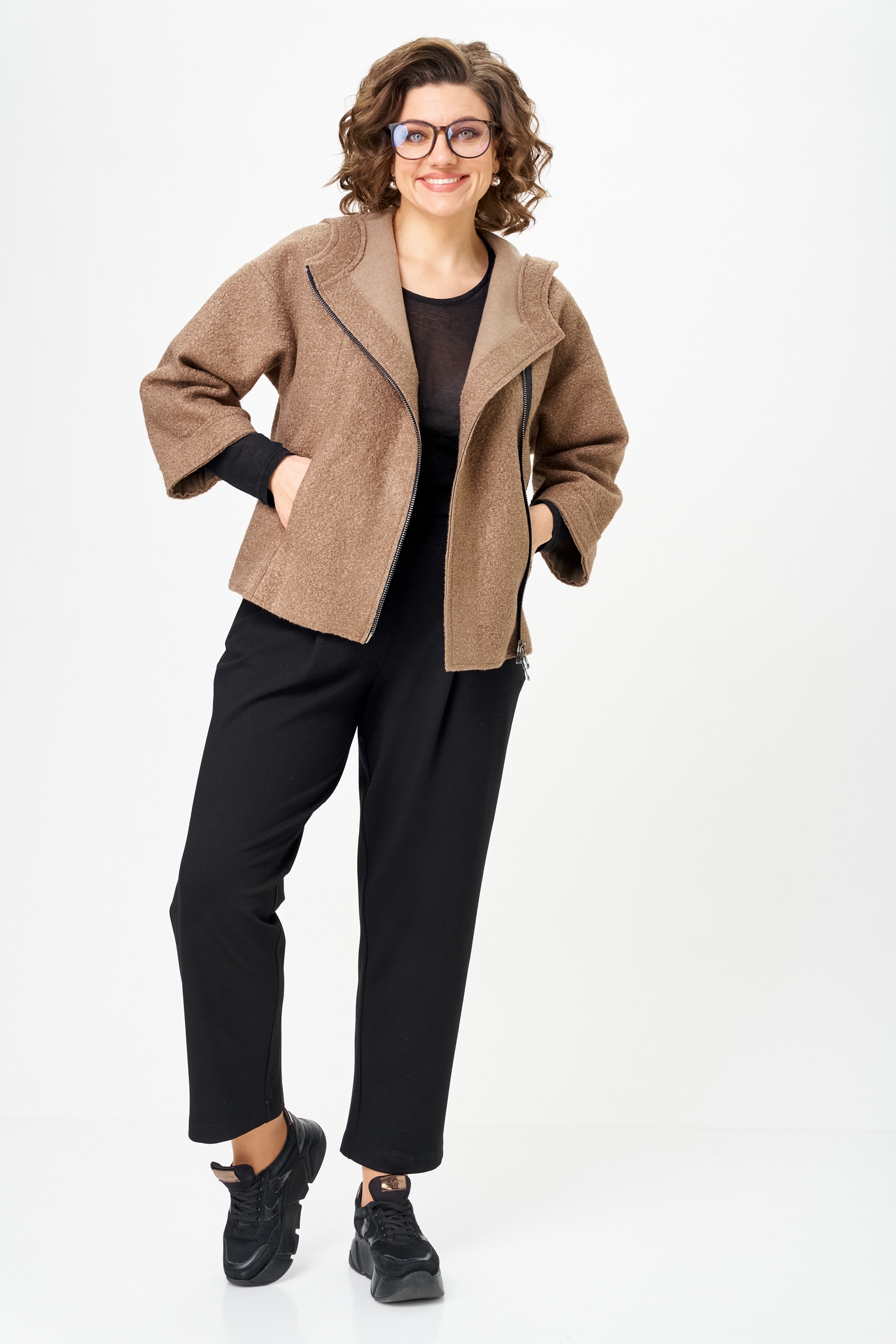 Курточка из букле — особая изюминка комплекта. Благодаря рукаву ¾ она универсальна: зимой её удобно носить в помещении как дополнительный слой, а весной, летом и осенью — как самостоятельную верхнюю одежду. Необработанные края придают образу модную лёгкую небрежность, а молния добавляет практичности и динамики.