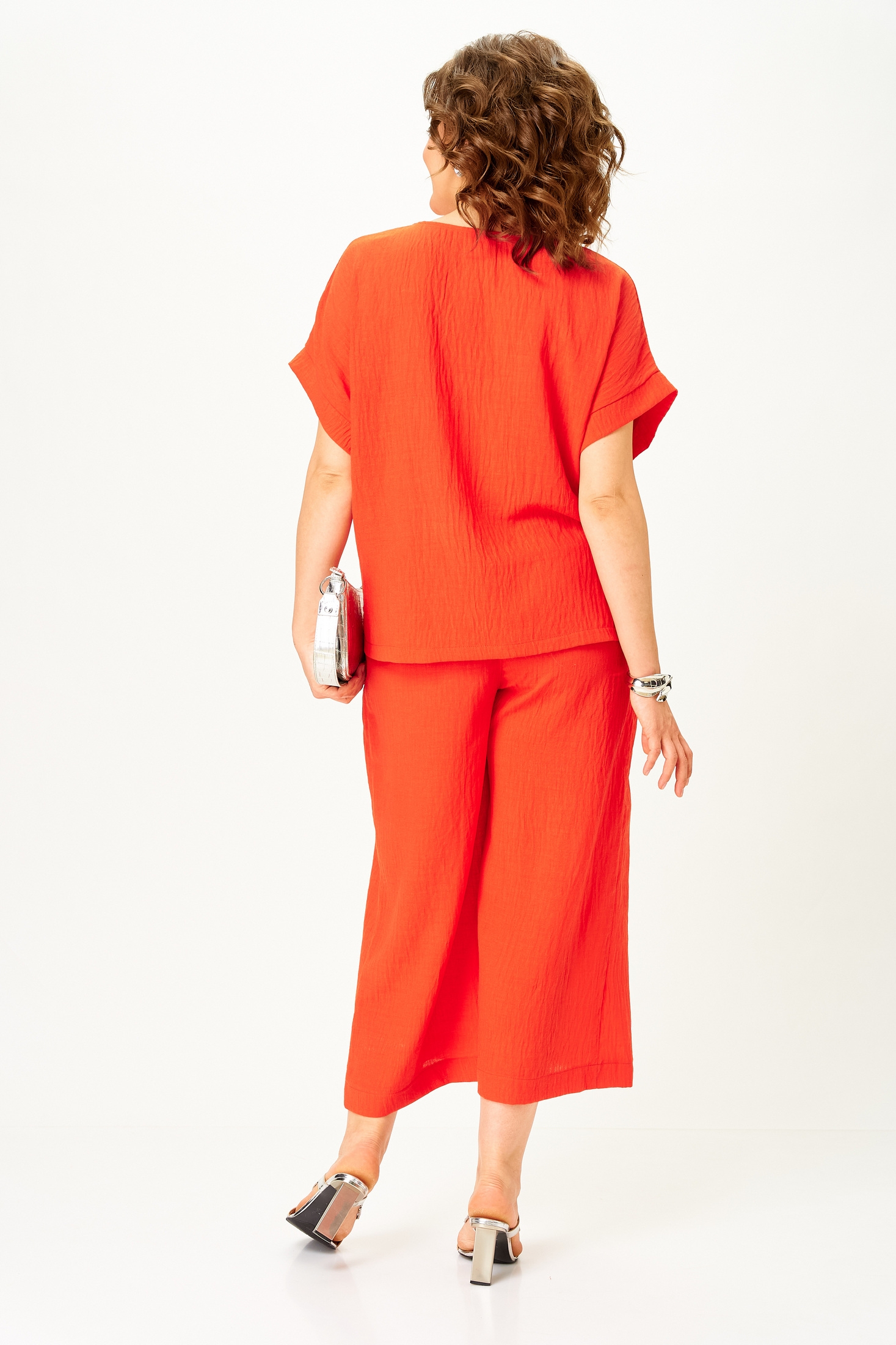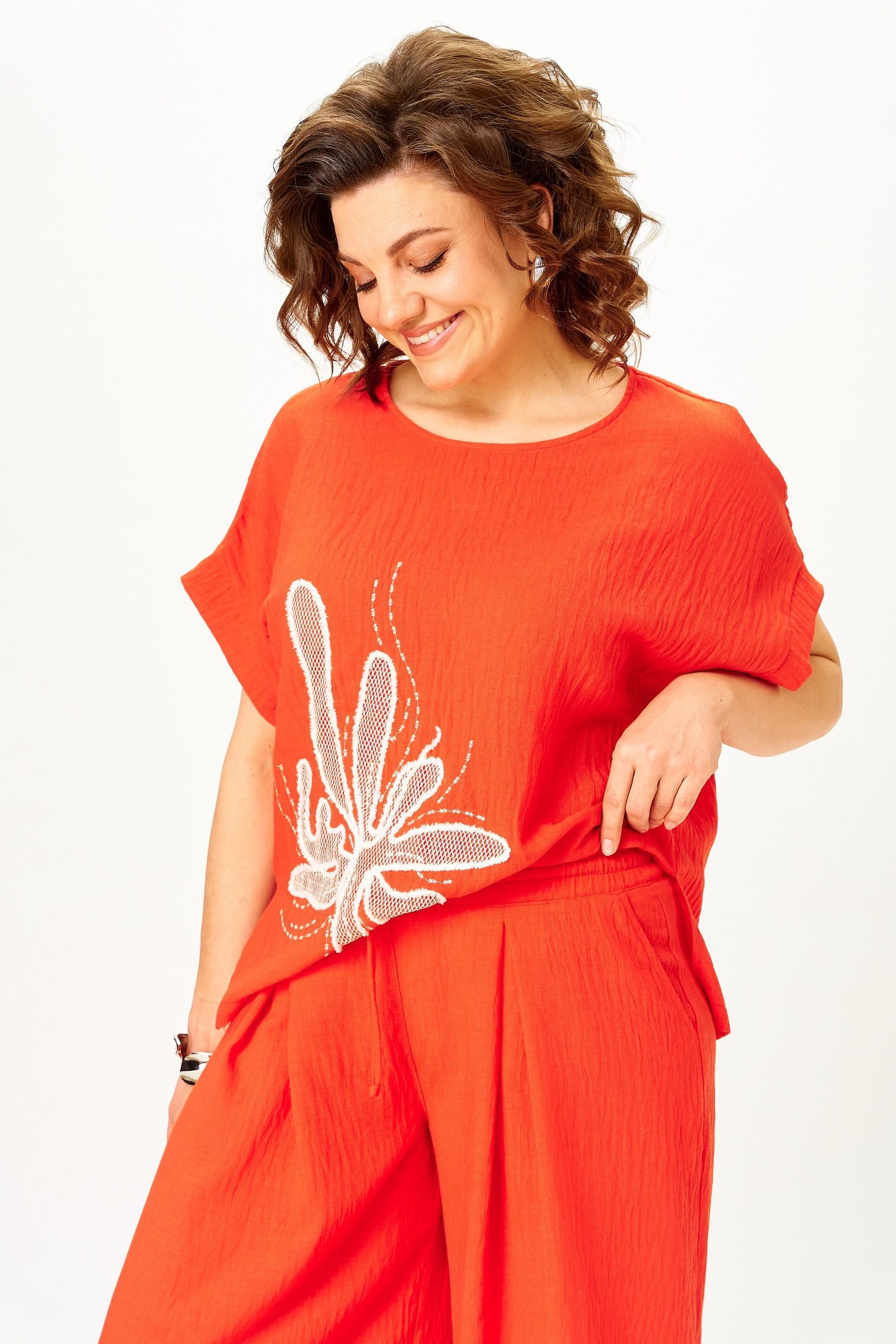 Костюм брючный 1451 красный коралл Michel Chic — это яркий летний комплект из коллекции бренда Michel Chic. Лёгкий фактурный искусственный муслин идеально подойдёт для жарких дней, обеспечивая дышащий комфорт, быстрое высыхание и минимальную сминаемость. Комплект состоит из кюлотов палаццо, которые свободно струятся от бедра, и свободного топа, украшенного выразительной вышивкой. Защипы и удобный пояс на резинке добавляют комфорт и эффектный силуэт. Яркий красный коралл подчеркнёт ваш образ на городских прогулках и в отпуске. Длина блузы по спинке составляет 60 см +/- 2-3 см, длина кюлот по шаговому шву — 55 см +/- 1-2 см, по боковому шву — 86 см +/- 1-2 см. Для роста 170 см.