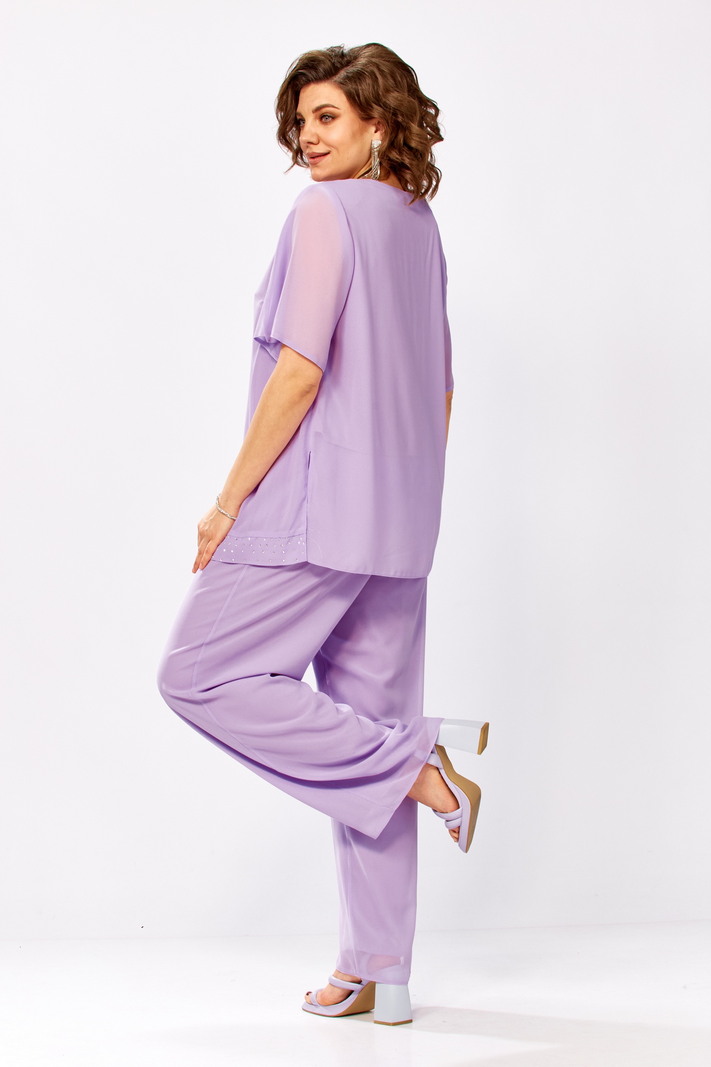 Костюм брючный 5689 Mira Fashion — идеальный выбор для вашего торжества. Коллекция бренда Mira Fashion предлагает стильные решения для женщины любого возраста. Материал костюма выполнен из воздушного шифона, который не только легок и приятен на ощупь, но и не мнется, позволяя сохранять идеальный вид в течение всего времени носки. Подклад из трикотажа обеспечивает комфорт и воздухопроницаемость. Ассиметричный крой с украшенными стразами планками добавляет нарядности, а весенние оттенки создают яркое настроение. Брюки на резинке и высокая посадка визуально стройнят фигуру, идеально подходя для полных женщин. Лавандовый цвет и свободный крой делают этот костюм актуальным выбором для свадеб, юбилеев и других значимых событий. Длина рукава составляет 30 см, что делает костюм отличным выбором для весенне-летнего сезона.