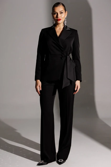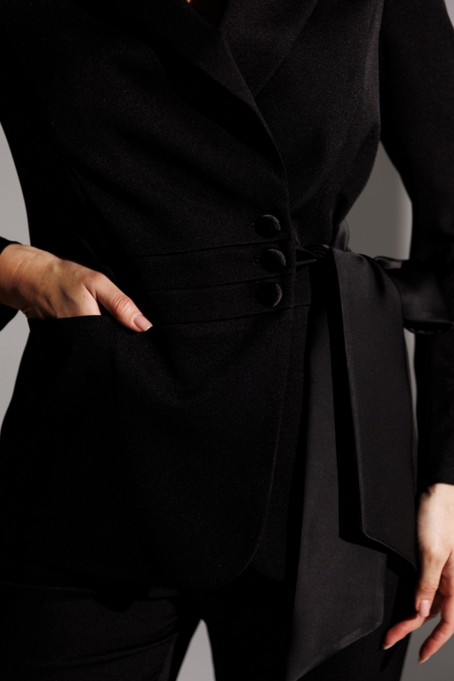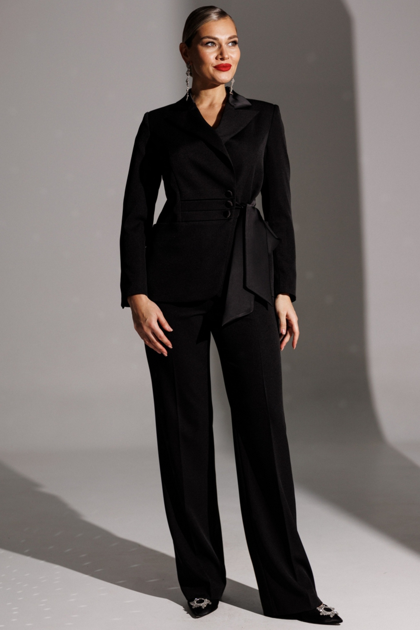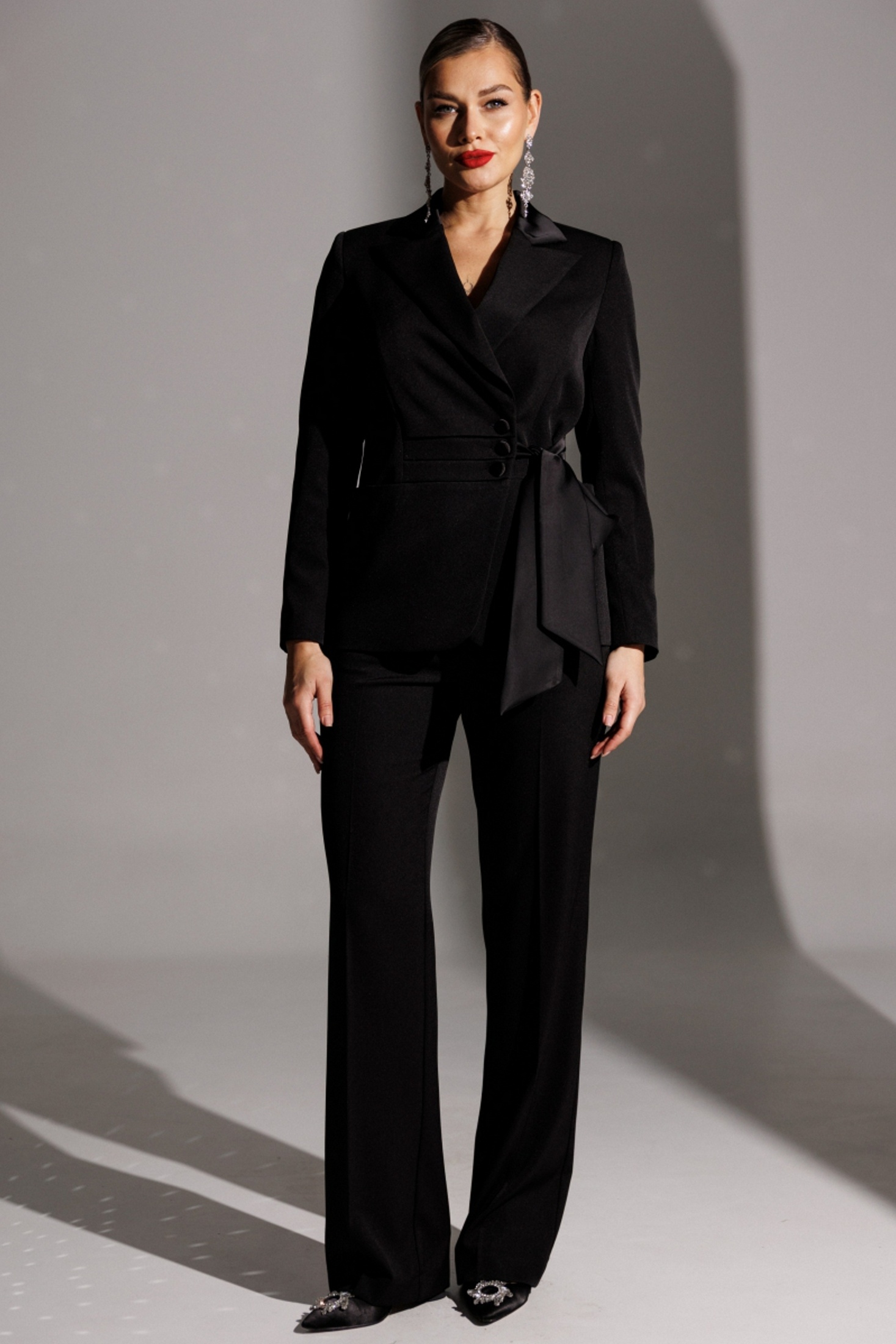 Жакет полуприлегающего силуэта с двухбортной застежкой на три обтяжные из атласной ткани пуговицы и одной потайной. Край борта овальной формы, что придаёт жакету утонченность. По переду обработаны фигурные рельефы из проймы, также имеется горизонтальный подрез,в котором расположены карманы. На правой центральной части полочки - три складки, параллельные подрезу. Дополнительно с левой стороны завязывается атласный бант,что придает нарядность и особый шарм. Одна часть банта крепиться на пуговицу, другая в боковом шве. Спинка со средним швом и вертикальными рельефами из проймы. Воротник пиджачного типа из атласной ткани с пикообразными лацканами. Рукава двухшовные, со шлицей в локтевом шве на одну пуговицу, также обтяжную из атласа. Жакет на подкладке. Брюки классические,со стрелками,с притачным поясом-сзади частично на резинке для удобства и комфортной посадки. На поясе имеются пять шлёвок. На передних половинках присутствуют карманы. Застёжка на молнию и пуговицу.Костюм выполнен из качественной костюмной ткани с отделкой из атласа. длина спинки жакета: 67 см