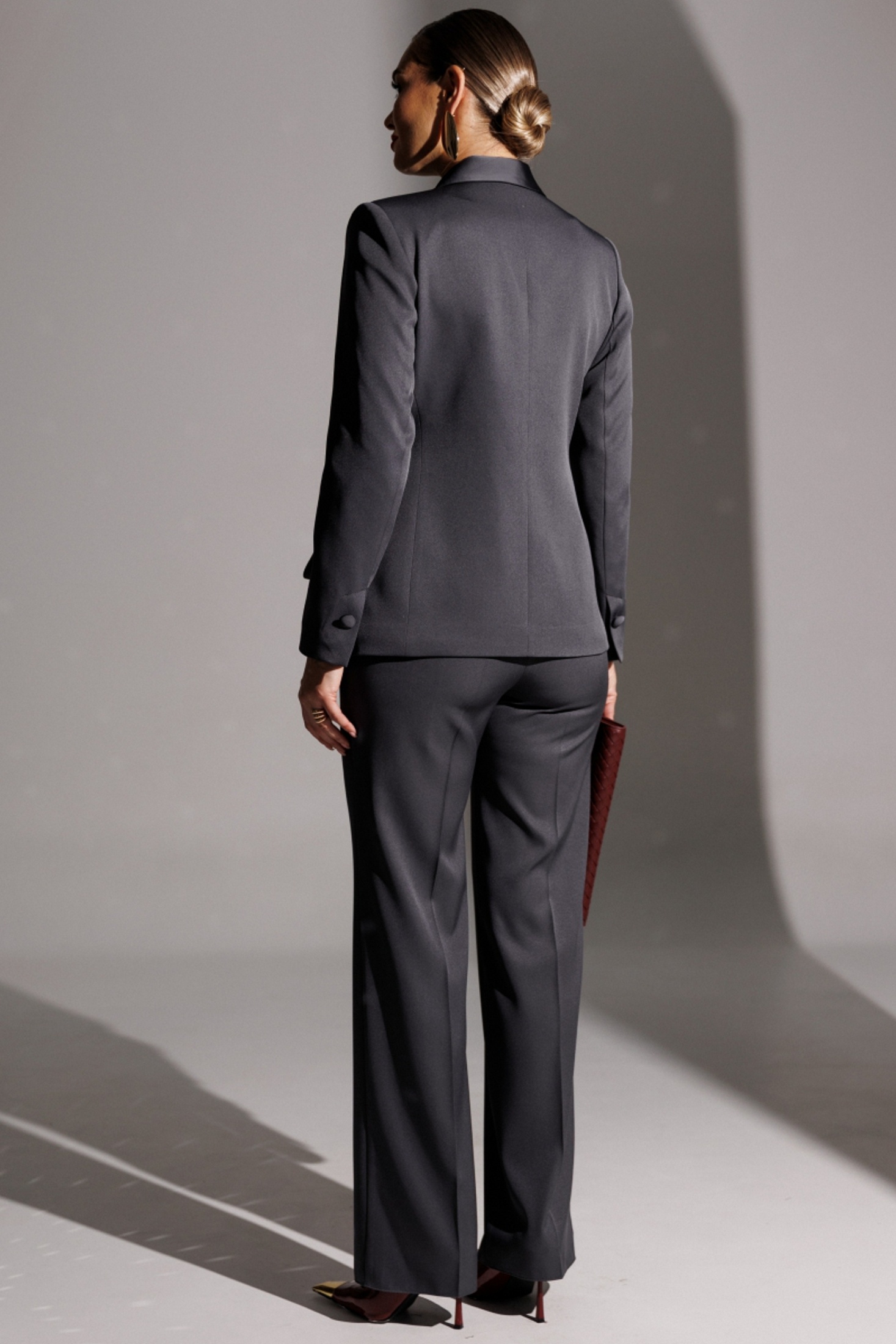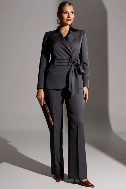 Жакет полуприлегающего силуэта с двухбортной застежкой на три обтяжные из атласной ткани пуговицы и одной потайной. Край борта овальной формы, что придаёт жакету утонченность. По переду обработаны фигурные рельефы из проймы, также имеется горизонтальный подрез,в котором расположены карманы. На правой центральной части полочки - три складки, параллельные подрезу. Дополнительно с левой стороны завязывается атласный бант,что придает нарядность и особый шарм. Одна часть банта крепиться на пуговицу, другая в боковом шве. Спинка со средним швом и вертикальными рельефами из проймы. Воротник пиджачного типа из атласной ткани с пикообразными лацканами. Рукава двухшовные, со шлицей в локтевом шве на одну пуговицу, также обтяжную из атласа. Жакет на подкладке. Брюки классические,со стрелками,с притачным поясом-сзади частично на резинке для удобства и комфортной посадки. На поясе имеются пять шлёвок. На передних половинках присутствуют карманы. Застёжка на молнию и пуговицу.Костюм выполнен из качественной костюмной ткани с отделкой из атласа. длина спинки жакета: 67 см