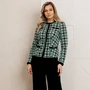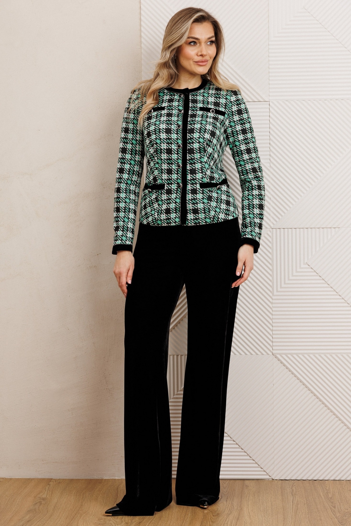Брючный костюм в стиле Шанель представляет собой элегантное сочетание классики и современности. Жакет выполнен из трикотажного полотна с актуальным принтом «гусиная лапка», имеет полуприлегающий силуэт и центральную застежку на пуговицы. Спинка оформлена средним швом и талиевыми вытачками, что обеспечивает идеальную посадку. Передняя часть также украшена талиевыми вытачками, а округлая горловина подчеркивает женственность образа.