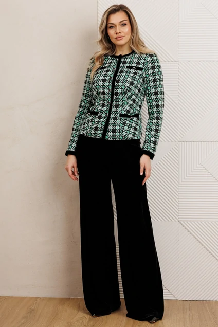 Функциональные карманы с листочками расположены внизу, в то время как имитация карманов в верхней части переда добавляет изюминку. Листочки на карманах и планка горловины выполнены из бархата с отделкой по краям, создавая контраст текстур. Рукава втачные, двухшовные, с планкой по низу, также отделанной бархатом. Жакет на подкладке, что обеспечивает комфорт при носке. Брюки палаццо из бархата имеют стильные широкие штанины и удобную резинку на поясе, что делает этот костюм идеальным выбором как для деловых встреч, так и для вечерних выходов.длина жакета по спинке: 56 см