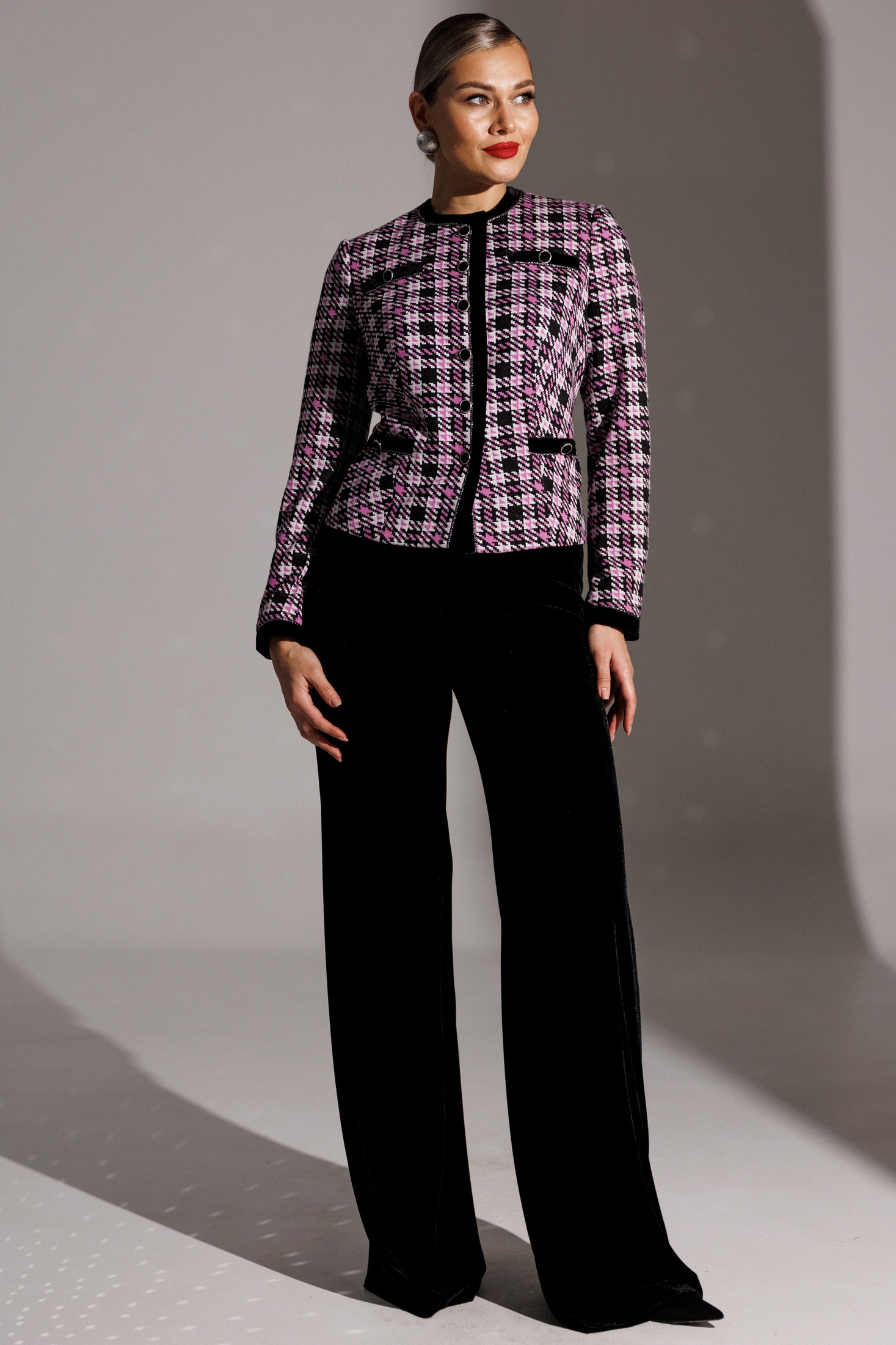Брючный костюм в стиле Шанель представляет собой элегантное сочетание классики и современности. Жакет выполнен из трикотажного полотна с актуальным принтом «гусиная лапка», имеет полуприлегающий силуэт и центральную застежку на пуговицы. Спинка оформлена средним швом и талиевыми вытачками, что обеспечивает идеальную посадку. Передняя часть также украшена талиевыми вытачками, а округлая горловина подчеркивает женственность образа.