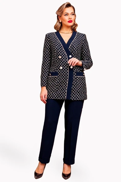 Если Вы только в начале пути к гардеробу Вашей мечты, то удлиненный жакет - отличный старт и отправная точка. Он станет Вам лучшим другом и превратит в настоящую леди. Мы предлагаем его в тандеме с прямыми, однотонными брюками. Брюки на притачном поясе-кокетке, со стрелками, на передних половинах брюк обработаны карманы. Низ брюк с отложной манжетой. Жакет двубортный, с нагрудными вытачками и рельефами, выполнен из костюмного полотна отличного качества. Полочка по борту с отрезной планкой. Спинка со средним швом и талиевыми вытачками. Рукав двухшовный с отлетной шлицей. Застежка на петли-пуговицы. Жакет на подкладке. Главным декором жакета является кант, который выполнен из сетки и цепочки.