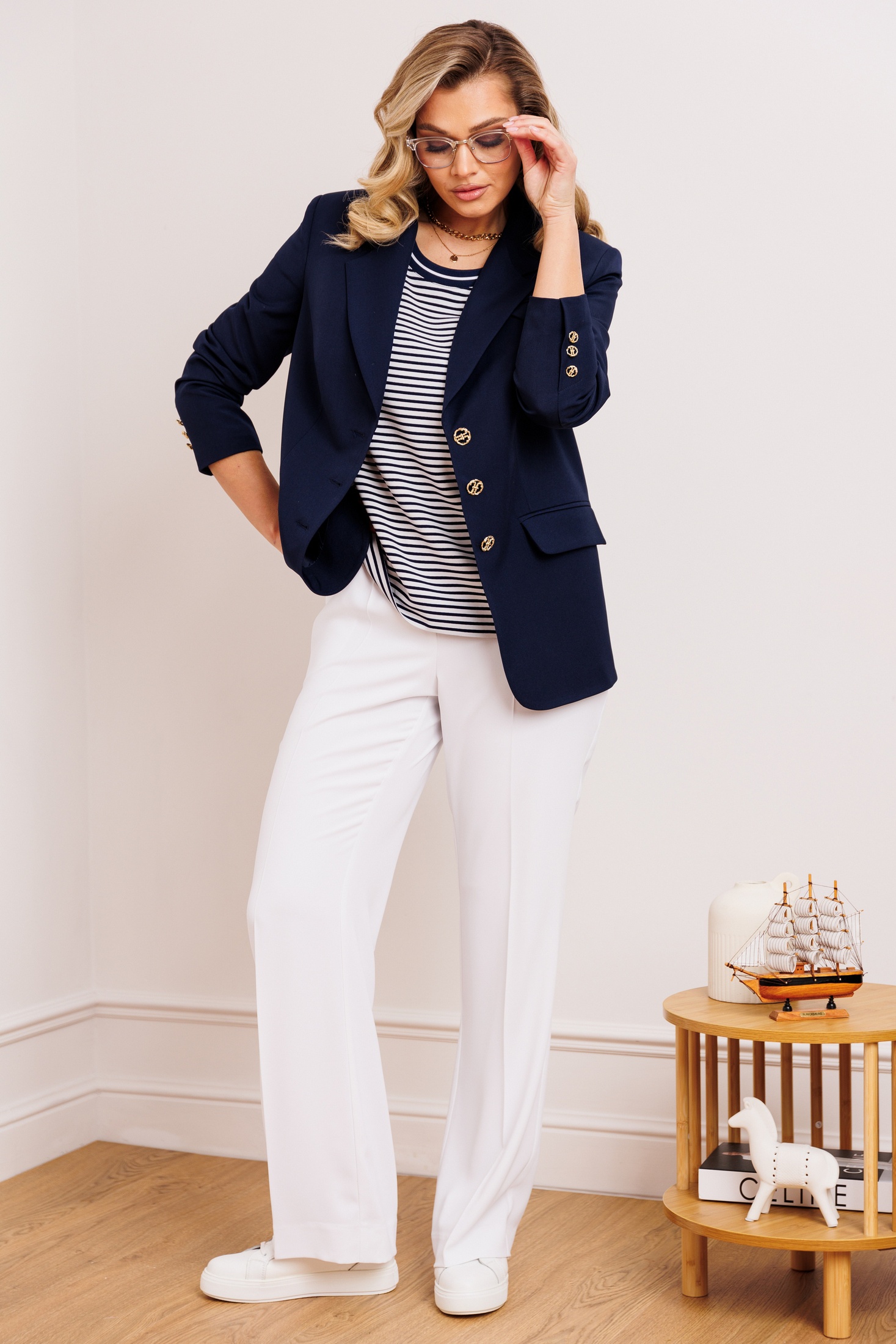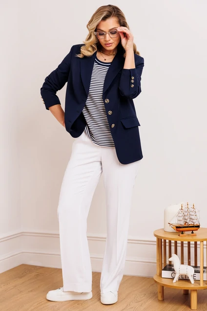 Костюм брючный 26-2891 синий Мода-Юрс предлагает уникальное сочетание стиля и удобства. Коллекция бренда Мода-Юрс включает этот элегантный трехпредметный комплект, состоящий из жакета, топа и брюк. Жакет полуприлегающего силуэта с пиджачным воротником и центральной застежкой на пуговицы подходит для офисного стиля. Брюки прямые, с карманами и эластичной резинкой сзади, дополняют ансамбль. Топ с разрезами по бокам и округлым воротом добавляет легкость образу. Материалы включают полиэстер, вискозу и спандекс, что обеспечивает комфорт и долговечность. Синий цвет костюма позволяет легко комбинировать его с другими элементами гардероба. Длина спинки составляет 72 см, рукава — 61 см, а брюк — 109 см, что делает этот костюм идеальным для осеннего делового сезона.
