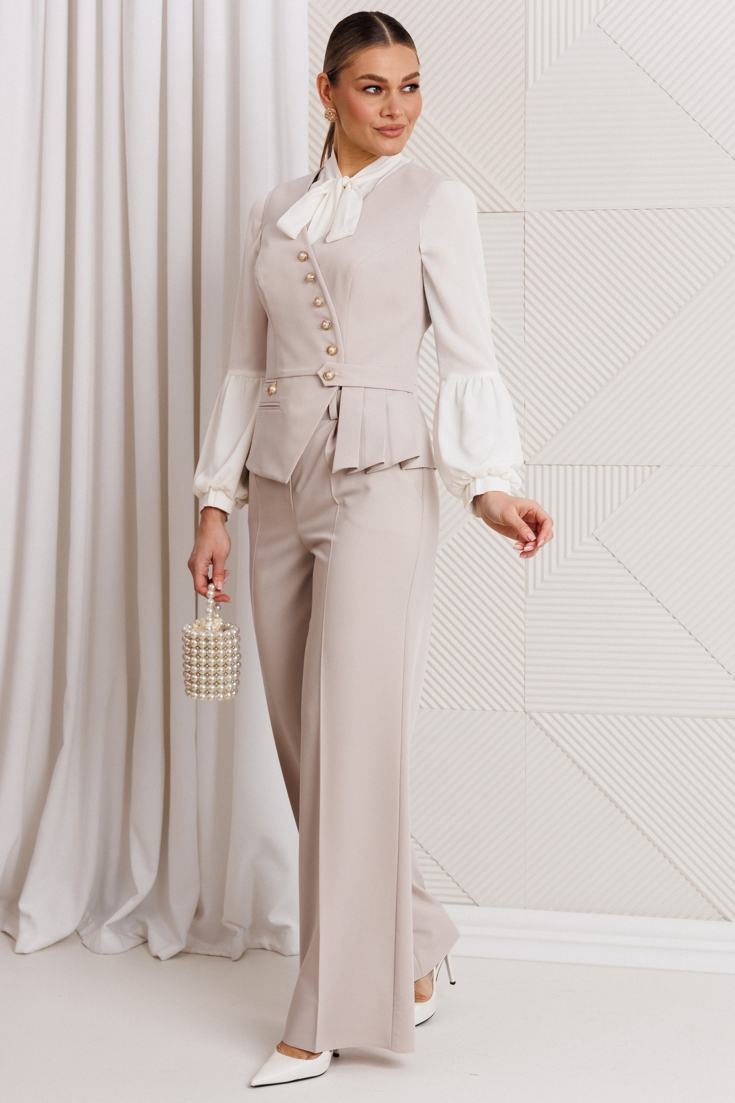 Костюм брючный 26-2912 беж Мода-Юрс из коллекции бренда Мода-Юрс, выполнен из практичного полиэстера с вискозой и спандексом. Жилет с двубортной застежкой и асимметричным низом обеспечивает выделяющийся силуэт, дополненный функциональными карманами и подкладкой. Брюки на притачном поясе с резинкой сзади и молнией спереди обеспечивают комфорт при носке. Длина жилета составляет 56,4 см, а брюк — 107 см. Комплект идеально подходит для повседневной офисной носки благодаря спокойному бежевому цвету и стильному дизайну.