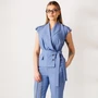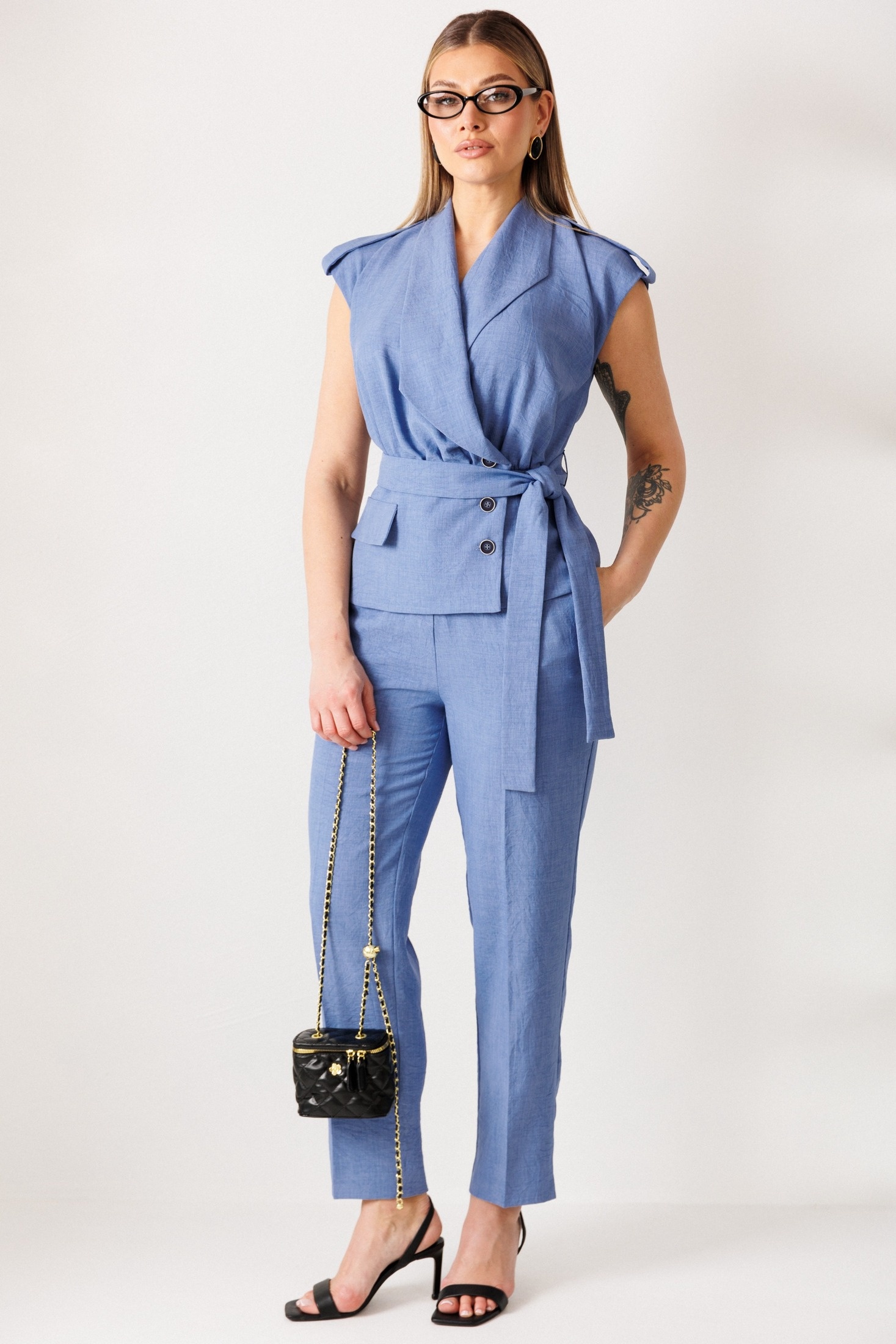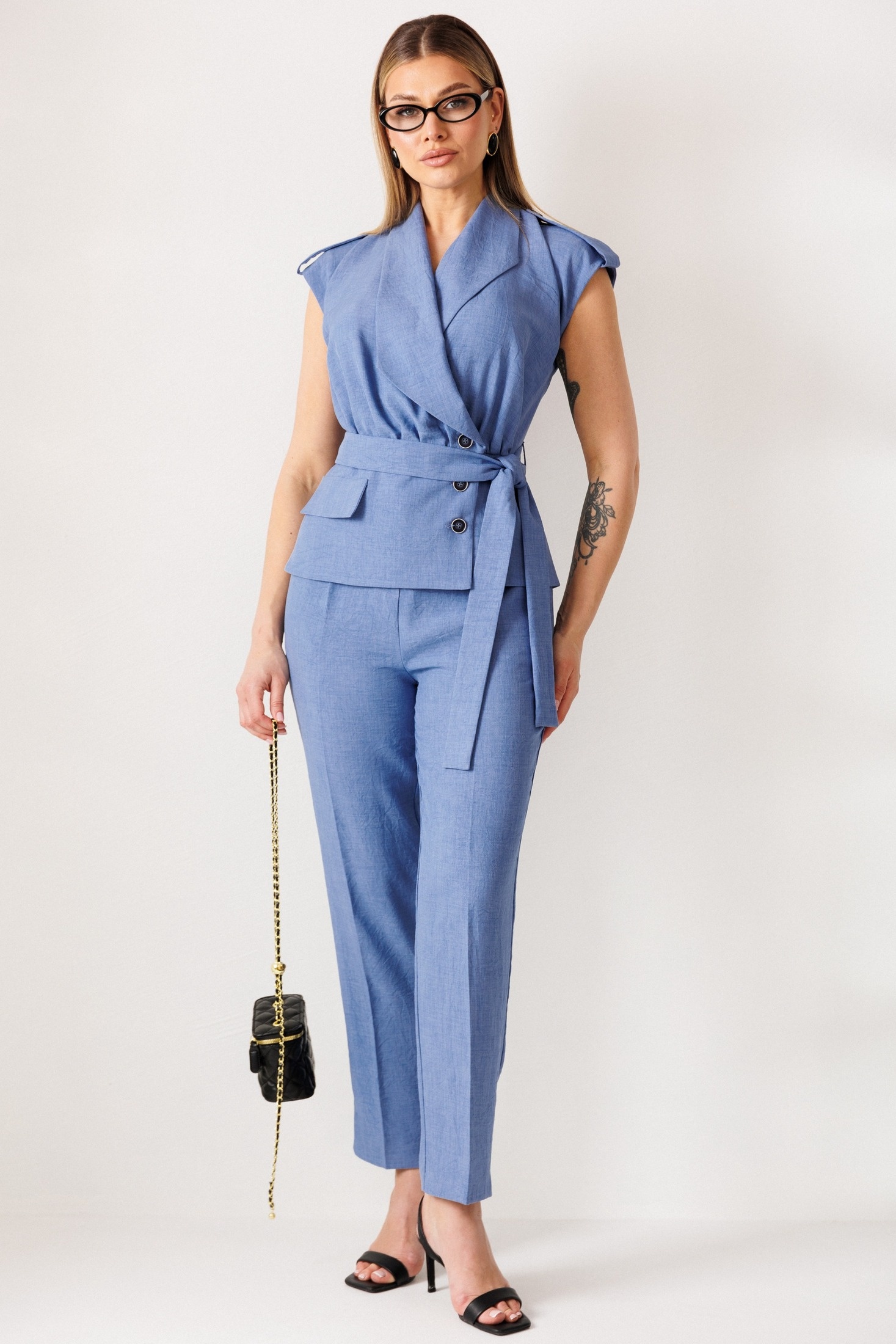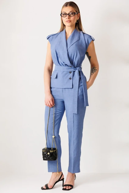 Костюм брючный 26-2975 джинс Мода-Юрс. Коллекция бренда предлагает стильный летний костюм, выполненный из сочетания льна и вискозы, что обеспечивает комфорт и легкость изделия. Жакет без рукавов с удлиненной линией плеча и баской создает эффектный объем, подчёркнутый сборкой по переду. Удобная застежка на три пуговицы и пояс с шлевками добавляют практичности и выразительности. Классические зауженные брюки с разрезами на низу и кокетливым поясом отличаются свободой движений. Длина спинки жилета составляет 60 см, а брюки - 103 см. Нежно-голубой цвет делает костюм отличным выбором для летних прогулок и офиса.