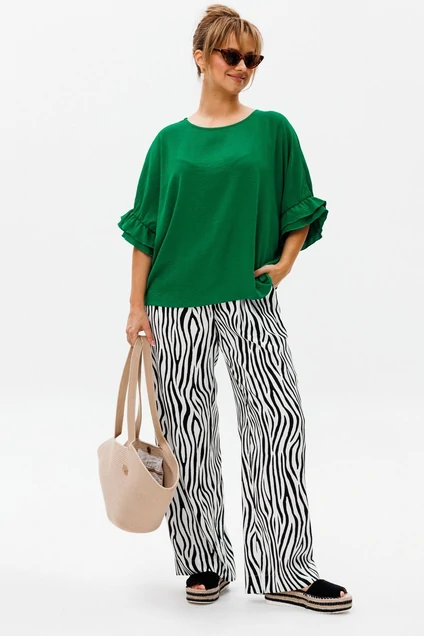 Блуза прямого свободного силуэта со спущенной линией плеча, выполненная из блузочной ткани (тянется). Горловина округлой формы, обработана окантовкой. Спинка со средним швом. Низ рукава оформлен двумя волонами, присборенными на резинку.