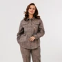 Жакет полуприлегающего силуэта, выполнен из костюмной ткани (чуть тянется) с модным принтом «Леопард», на подкладке. По переду талиевые вытачки, отрезной бочок, функциональные прорезные карманы с клапаном, центральная двубортная застежка на петли-пуговицы. Горловина оформлена глубоким V-образным вырезом и широким воротником пиджачного типа. Спинка со средним швом. Рукава втачные, двухшовные со шлицами и отделочными пуговицами. Маленьким акцентом ультрамодного жакета являются стильные металлические пуговицы.