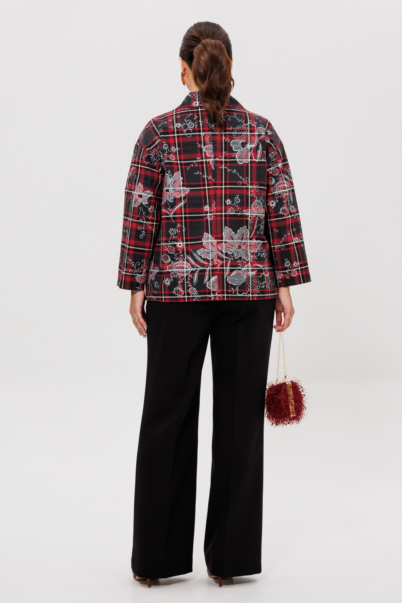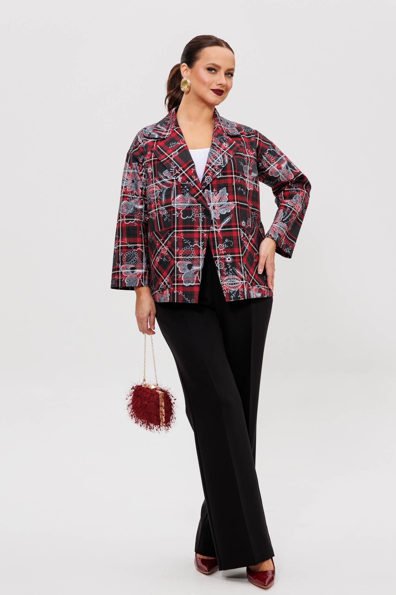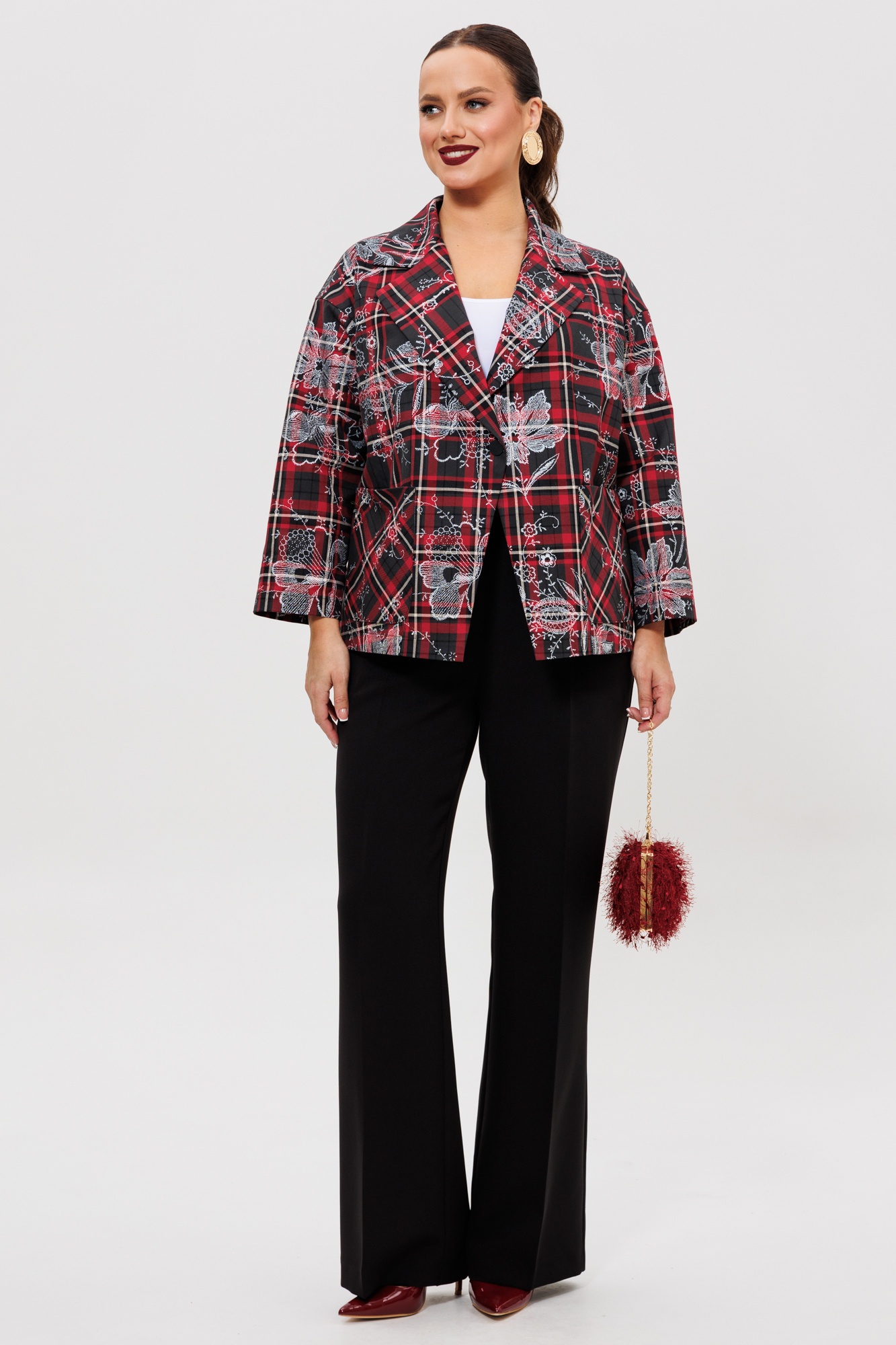 Жакет прямого силуэта со спущенной линией плеча, выполнен из костюмной ткани в клетку с принтом имитация вышивки (не тянется). По переду нагрудная вытачка, накладные карманы, центральная застежка на одну петлю-пуговицу. Горловина оформлена воротником пиджачного типа с лацканом. Спинка со средним швом. Рукава одношовные, длиной 7/8. Жакет без подкладки.
