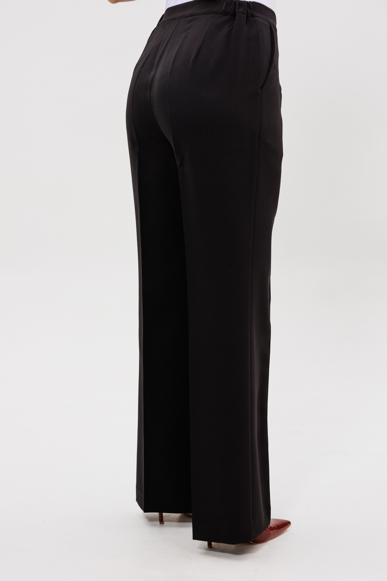 Брюки прямого кроя с высокой посадкой, выполненные из костюмной ткани (чуть тянется) с наклонными карманами в боковых швах. По срезу банта застежка-молния. Верхний срез оформлен поясом с эластичной резинкой по задней половинке.