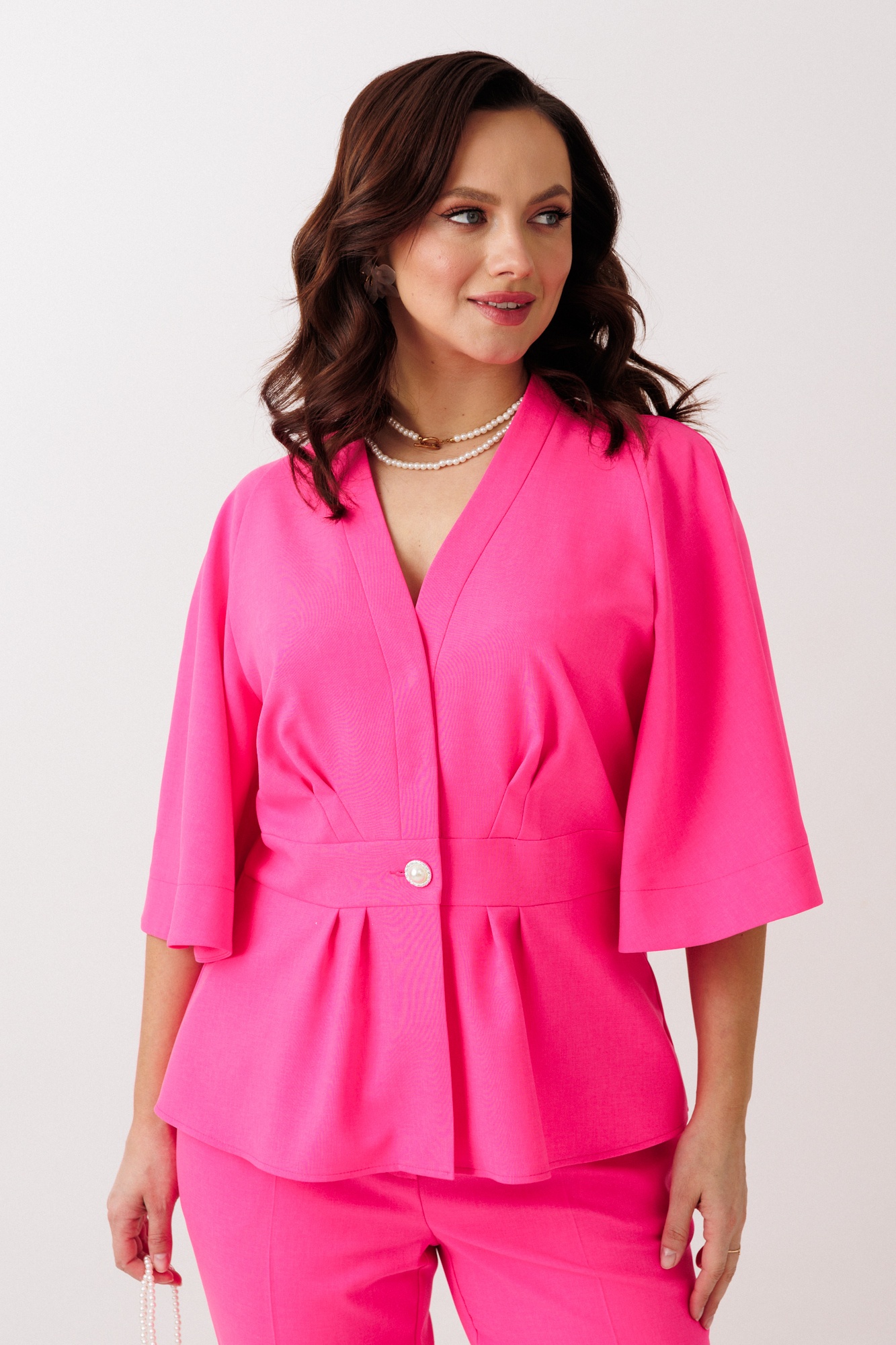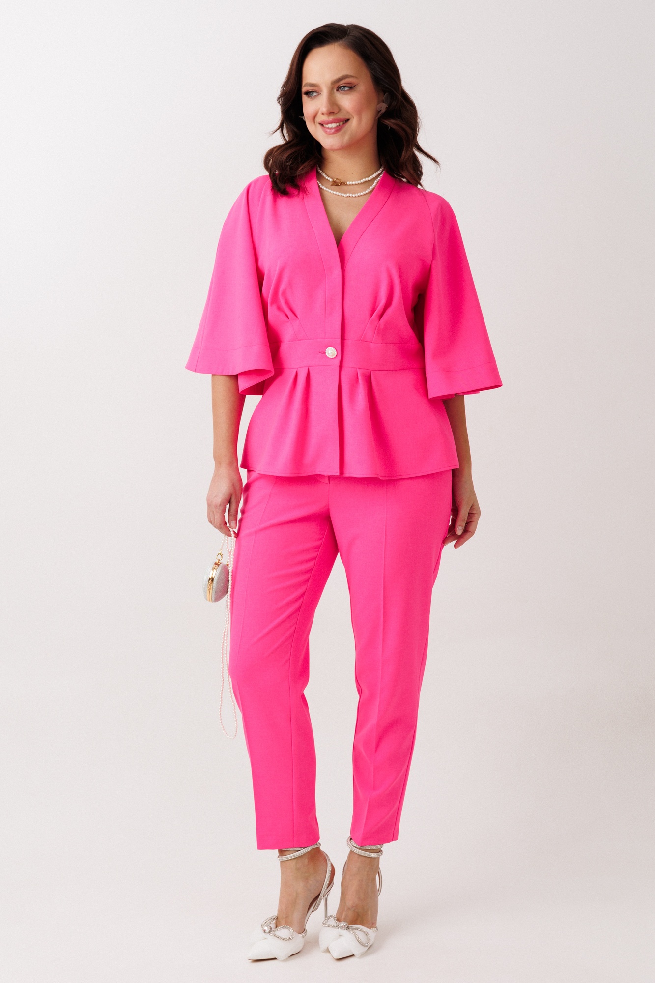 Костюм брючный 324 фуксия Мублиз представляет собой стильное сочетание жакета и брюк, выполненное из чуть тянущейся костюмной ткани. Коллекция бренда Мублиз предлагает полуприлегающий жакет с отрезным поясом, баской и V-образным вырезом, который подчёркивает женственность. Особенностью являются односторонние складки и талиевые вытачки, добавляющие уникальность в каждую деталь. Жакет застёгивается на кнопки и отделочную пуговицу, а расширенные рукава покроя «реглан» создают выразительный силуэт. Брюки с высокой посадкой, зауженные к низу и длиной 7/8, обеспечивают комфорт и элегантность. Наклонные карманы в боковых швах добавляют практичности. Этот костюм идеально подходит для офисного или делового стиля, а его яркий фуксиевый цвет привлекает внимание и задаёт настроение в любое время года.