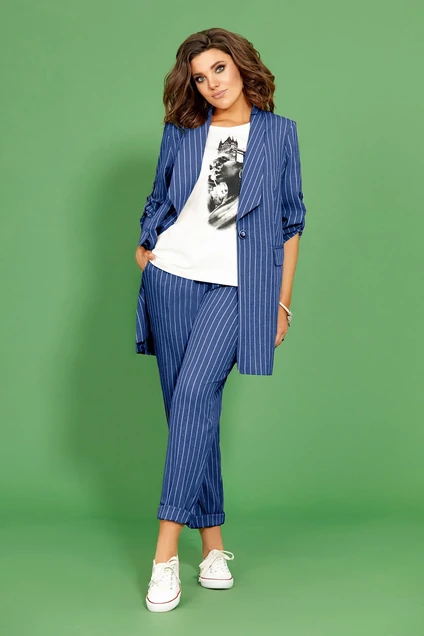 Костюм женский трех предметный, состоящий из жакета, блузы и брюк. Жакет полуприлегающего силуэта, удлиненный, выполнен из текстильного полотна в полоску (лён-вишер, не тянется). Вырез горловины глубокий с отворотом, застежка на одну петлю и пуговицу. Рукав втачной, по полочкам обработаны прорезные карманы с клапаном. По спинке отделочный элемент в виде широкого пояса. Блуза полуприлегающего силуэта из вискозы (тянется). Вырез горловины круглый, обработан обтачкой, рукав втачной. Декором служит принт по полочке. Брюки прямые, зауженные к низу, на притачном поясе. Пояс по кругу на резинке. Длина жакета – 86 см. Длина рукава - 62 см. Ширина рукава в пройме – 42 см. Длина блузы – 56 см. Длина рукава блузы – 29 см. Ширина рукава в пройме – 36 см. Длина брюк – 102 см. Состав: брюки и жакет – лён 45, лайкра 20, хлопок 35