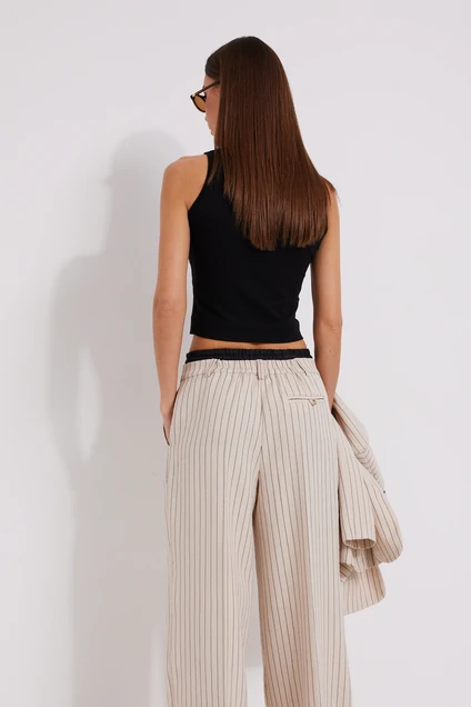 Брюки расширенные к низу, со стрелками. На передней половинке складка, имитация застежки и боковой карман. На правой задней половинке имитация кармана в рамку с петелькой и отделочной пуговицей. Верхний срез обработан поясом из двух видов ткани: основной – ос шлевками, отделочной пуговицей и сзади с резинкой. Отделочный пояс выглядывает из основного, он на резинке и со шнурком.