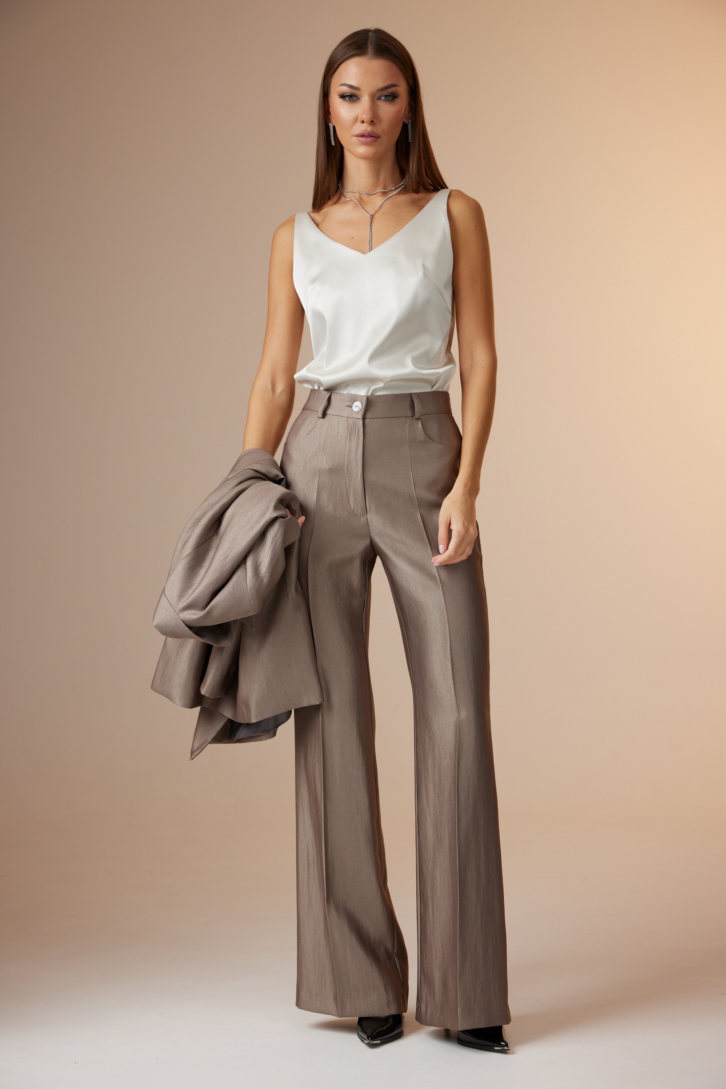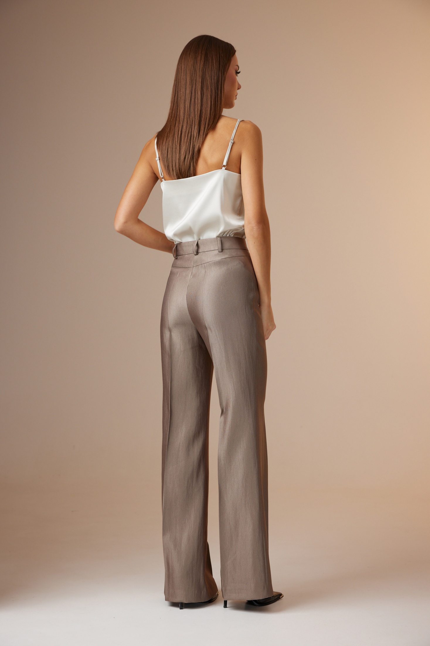 Топ: выполнен из атласной ткани, полуприлегающего силуэта, с регулируемыми бретелями по длине. Вырез горловины «О»-образный.