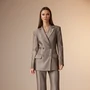 Жакет: полуприлегающего силуэта, втачного покроя. Изделие выполнено из костюмной ткани, на подкладке. Рукав двухшовный, длинный. Горловина оформлена воротником пиджачного типа. Перед имеет двухбортную застежку на две функциональные петли-пуговицы. По переду расположена нагрудная выточка, идущая из бокового шва, в области бедер расположены прорезные карманы в рамку с клапаном. Спинка имеет центральный шов и талевые вытачки.
