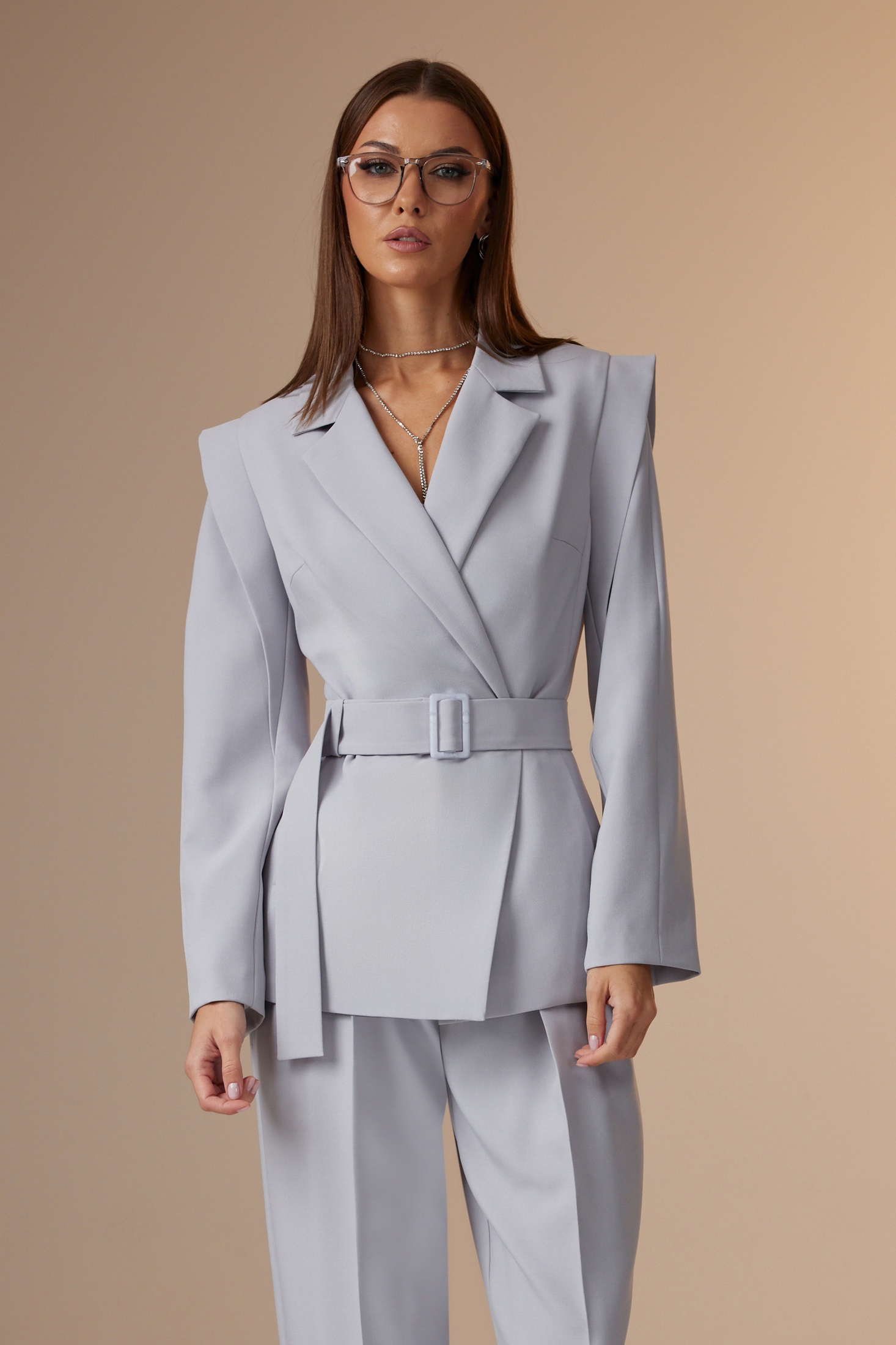 Жакет: полуприлегающего силуэта с двухбортной застежкой на одну пуговицу. Воротник пиджачного типа. Рукав длинный, трехшовный – дополнительный шов по центру верхней половинки для создания объема рукава, так же в швы верхних половин рукава вставлено крылышко для расширения линии плеча. По переду отрезной бочок, от него нагрудная вытачка и карманы в шве. Спинка со средним швом, отрезным бочком и талиевыми вытачками.